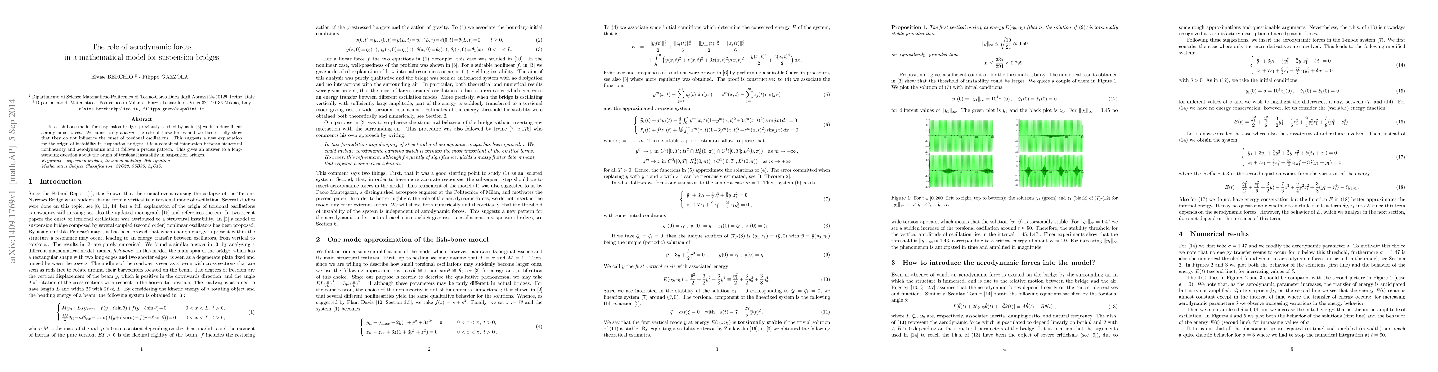 This paper investigates the impact of linear aerodynamic forces in a fish-bone model for suspension bridges, finding they do not affect the onset of torsional oscillations. It proposes that instability arises from a combination of structural nonlinearity and aerodynamics, providing a new explanation for torsional instability.