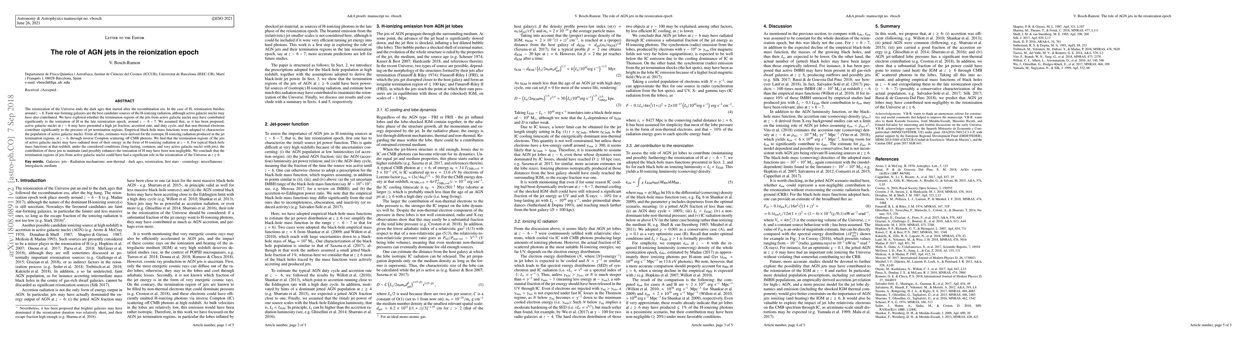 This paper investigates the potential contribution of active galactic nuclei (AGN) jets to the reionization epoch around $z\sim 6-7$. It finds that AGN jets may have significantly ionized hydrogen through H-ionizing radiation produced in their termination regions via inverse Compton scattering.