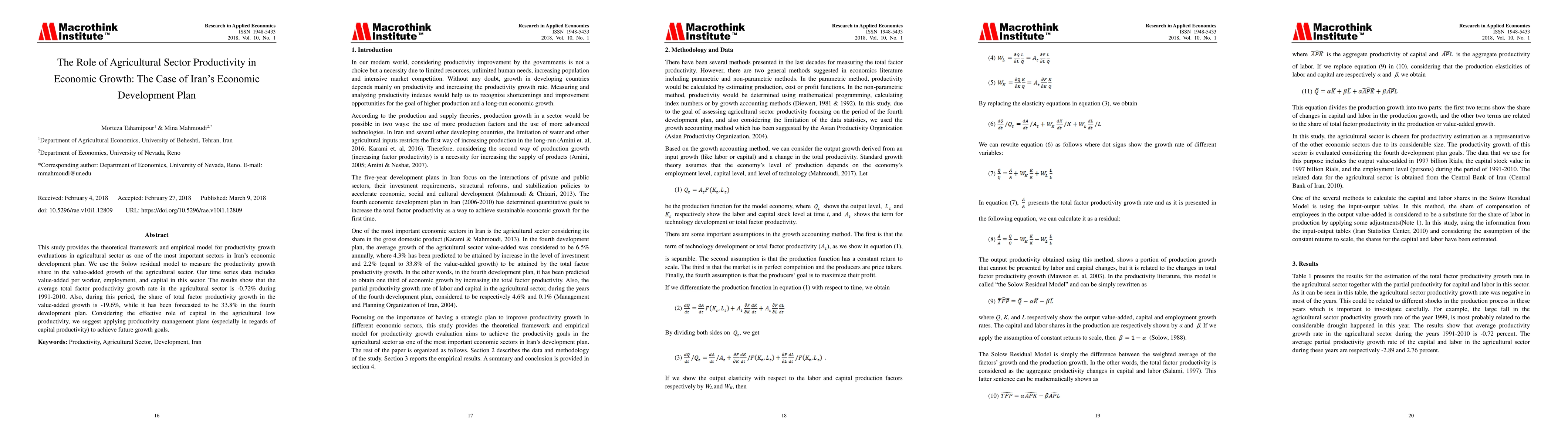 This study evaluates the productivity growth in Iran's agricultural sector using the Solow residual model, revealing a negative average total factor productivity growth rate of -0.72% from 1991-2010. Recommendations include implementing productivity management plans, particularly focusing on capital productivity, to meet future growth targets.