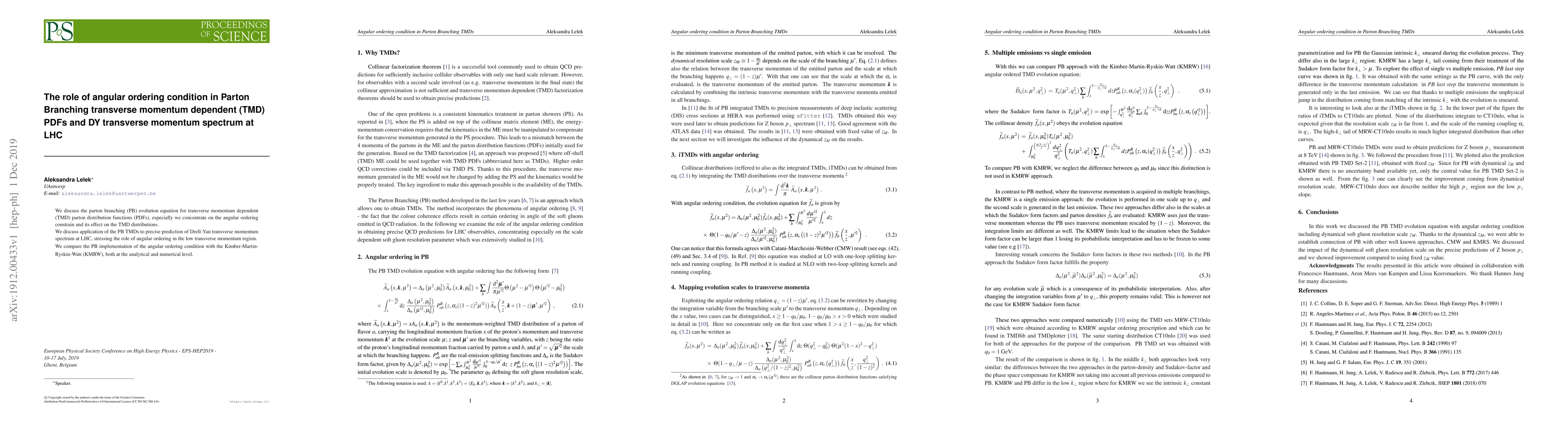 We discuss the parton branching (PB) evolution equation for transverse momentum dependent (TMD) parton distribution functions (PDFs), especially we concentrate on the angular ordering constrain and its effect on the TMD distributions. We discuss application of the PB TMDs to precise prediction of Drell-Yan transverse momentum spectrum at LHC, stressing the role of angular ordering in the low transverse momentum region. We compare the PB implementation of the angular ordering condition with the Kimber-Martin-Ryskin-Watt (KMRW), both at the analytical and numerical level.