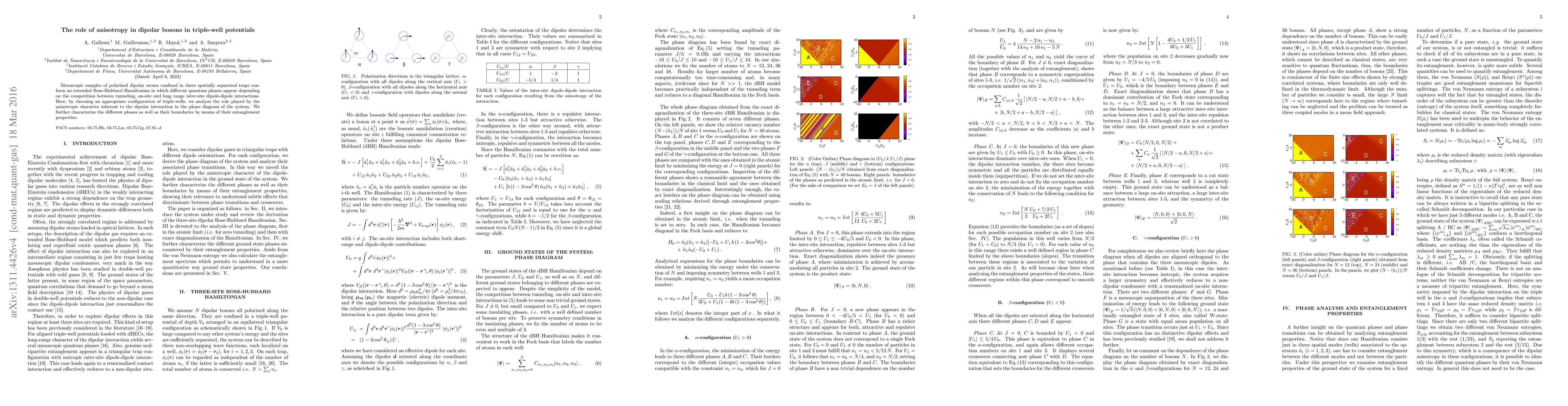 Mesoscopic samples of polarized dipolar atoms confined in three spatially separated traps conform an extended Bose-Hubbard Hamiltonian in which different quantum phases appear depending on the competition between tunneling, on-site and long range inter-site dipole-dipole interactions. Here, by choosing an appropriate configuration of triple-wells, we analyze the role played by the anisotropic character inherent to the dipolar interaction in the phase diagram of the system. We further characterize the different phases as well as their boundaries by means of their entanglement properties.