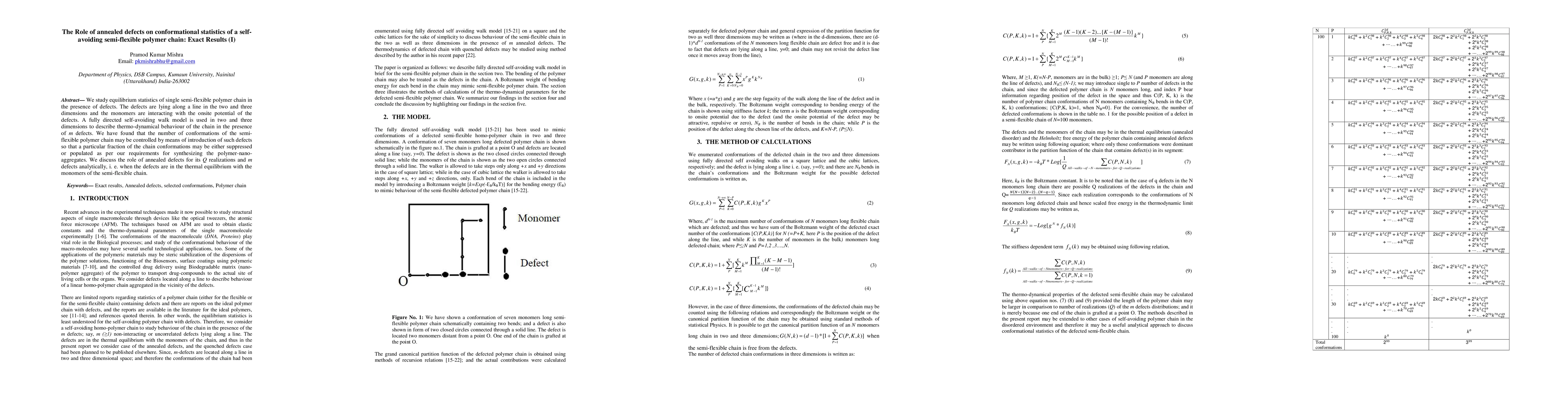 We study equilibrium statistics of single semi-flexible polymer chain in the presence of defects. The defects are lying along a line in the two and three dimensions and the monomers are interacting with the onsite potential of the defects. A fully directed self-avoiding walk model is used in two and three dimensions to describe thermo-dynamical behaviour of the chain in the presence of m defects. We have found that the number of conformations of the semiflexible polymer chain may be controlled by means of introduction of such defects so that a particular fraction of the chain conformations may be either suppressed or populated as per our requirements for synthesizing the polymer-nanoaggregates. We discuss the role of annealed defects for its Q realizations and m defects analytically, i. e. when the defects are in the thermal equilibrium with the monomers of the semi-flexible chain.