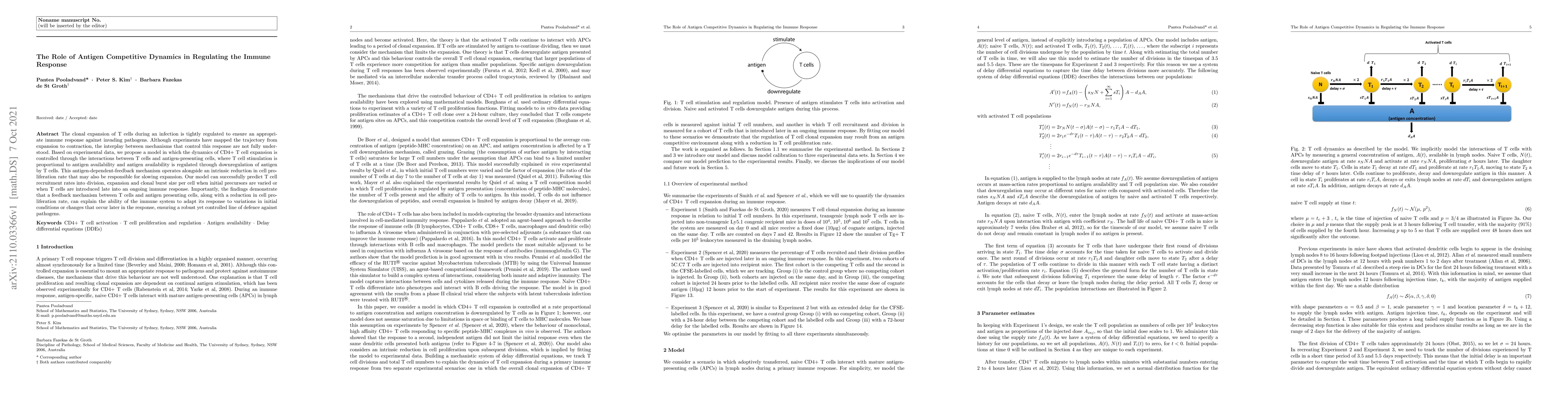 This paper proposes a model explaining the regulation of T cell expansion during an infection through antigen-competitive dynamics, showing that T cell stimulation and antigen availability feedback control the immune response. The model predicts T cell recruitment and clonal burst size, highlighting the role of antigen-dependent feedback and reduced proliferation in adapting the immune response.