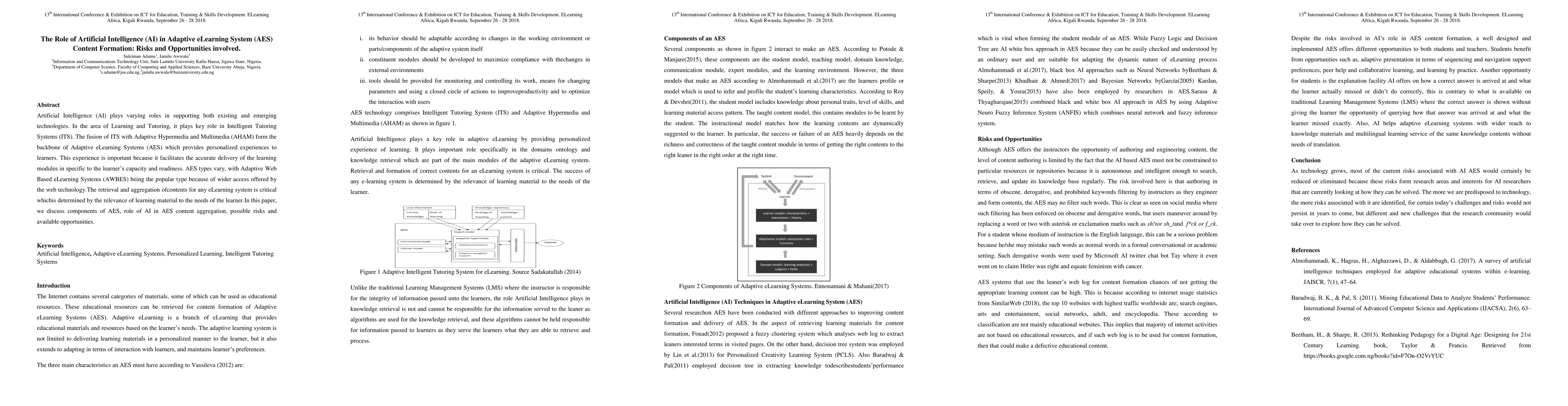 Artificial Intelligence (AI) plays varying roles in supporting both existing and emerging technologies. In the area of Learning and Tutoring, it plays key role in Intelligent Tutoring Systems (ITS). The fusion of ITS with Adaptive Hypermedia and Multimedia (AHAM) form the backbone of Adaptive eLearning Systems (AES) which provides personalized experiences to learners. This experience is important because it facilitates the accurate delivery of the learning modules in specific to the learner capacity and readiness. AES types vary, with Adaptive Web Based eLearning Systems (AWBES) being the popular type because of wider access offered by the web technology.The retrieval and aggregation of contents for any eLearning system is critical whichis determined by the relevance of learning material to the needs of the learner.In this paper, we discuss components of AES, role of AI in AES content aggregation, possible risks and available opportunities.