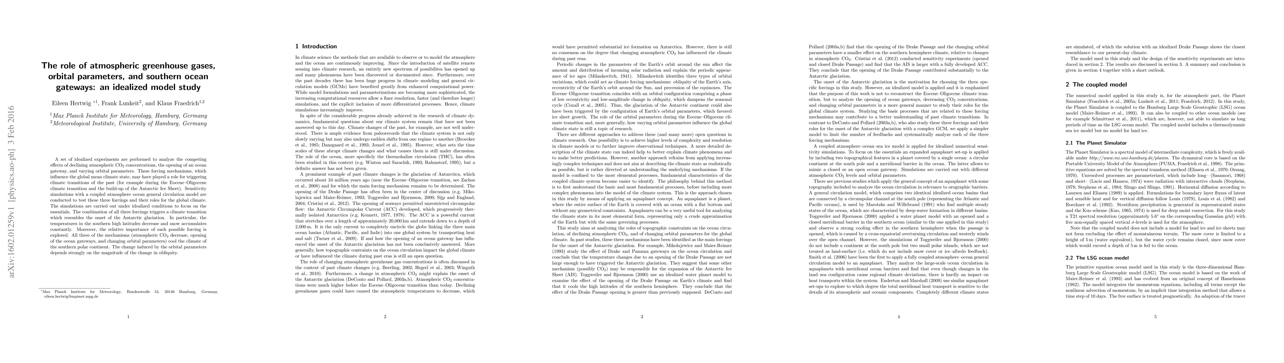 This paper uses idealized experiments to explore how declining atmospheric CO2, ocean gateway openings, and orbital parameter changes influence global climate transitions, particularly the onset of Antarctic glaciation. The study finds that all three mechanisms contribute to cooling the southern polar continent, with orbital changes having a significant effect depending on the obliquity magnitude.