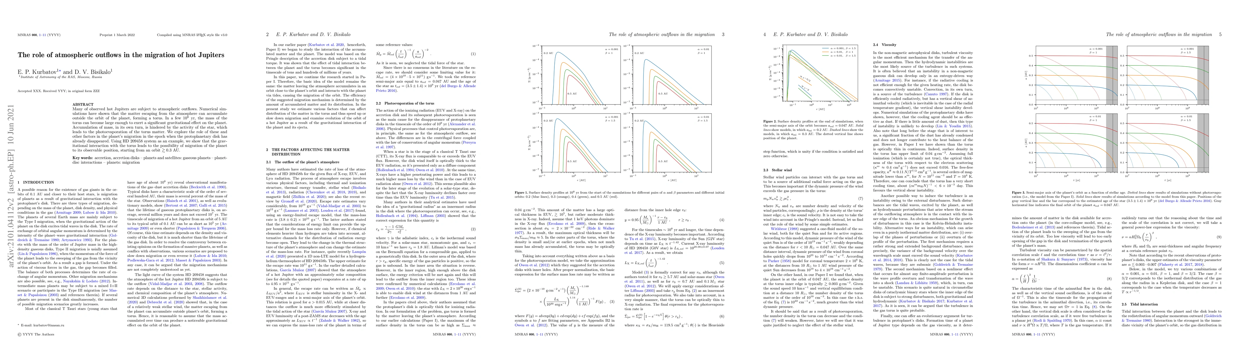 Many of observed hot Jupiters are subject to atmospheric outflows. Numerical simulations have shown that the matter escaping from the atmosphere can accumulate outside the orbit of the planet, forming a torus. In a few 10^8 yr, the mass of the torus can become large enough to exert a significant gravitational effect on the planet. Accumulation of mass, in its own turn, is hindered by the activity of the star, which leads to the photoevaporation of the torus matter. We explore the role of these and other factors in the planet's migration in the epoch when the protoplanetary disk has already disappeared. Using HD209458 system as an example, we show that the gravitational interaction with the torus leads to the possibility of migration of the planet to its observable position, starting from an orbit >= 0.3 AU.