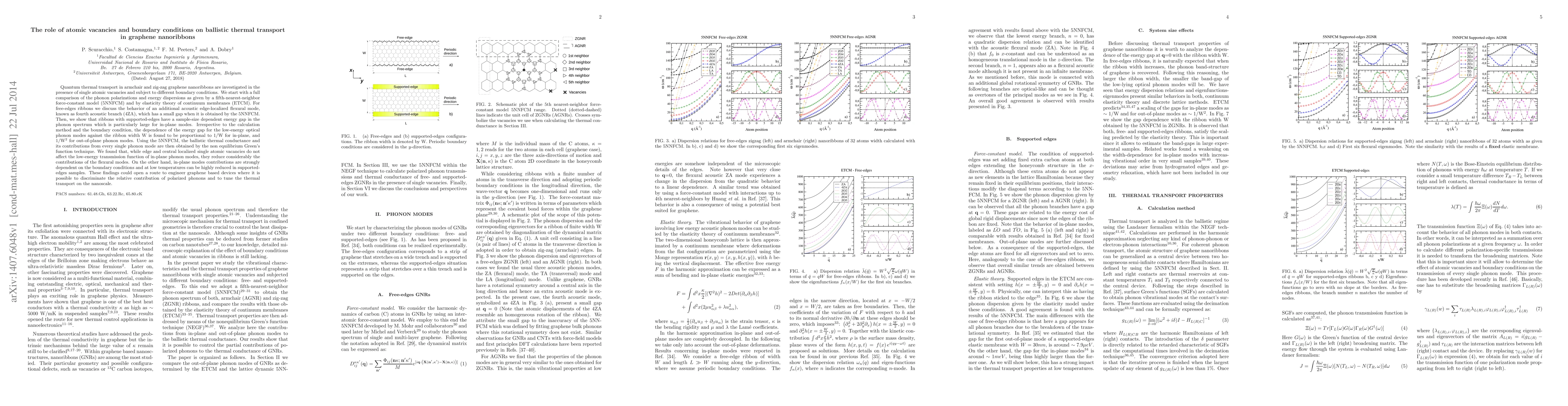 This paper investigates quantum thermal transport in graphene nanoribbons, focusing on the effects of atomic vacancies and boundary conditions on ballistic thermal conductance. It finds that while atomic vacancies reduce flexural mode contributions, boundary conditions significantly influence in-plane phonon modes, suggesting potential for nanoscale thermal transport engineering in graphene devices.