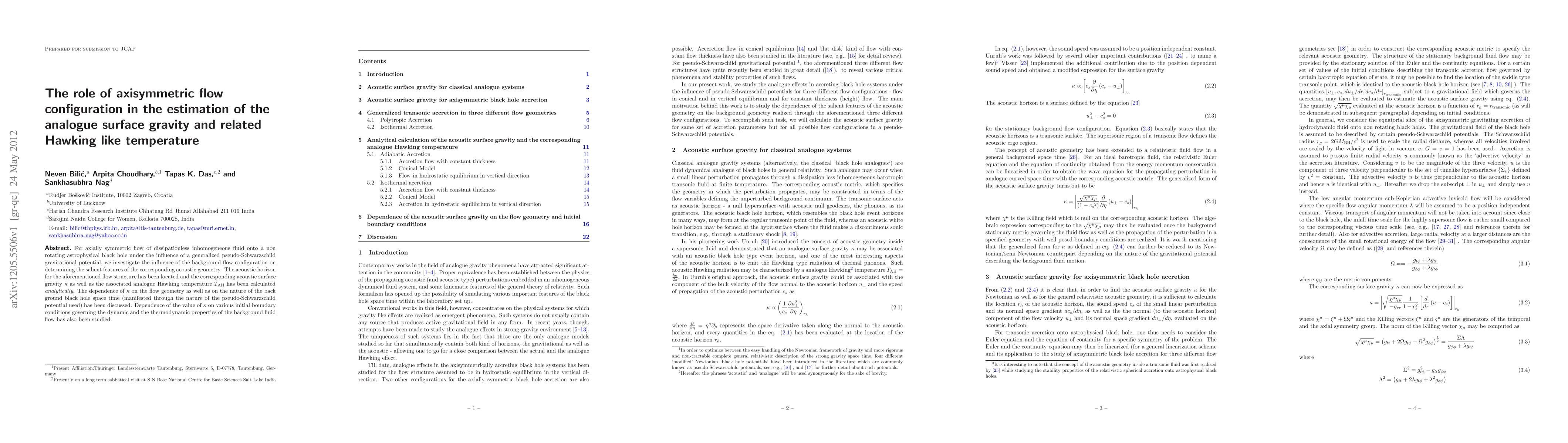 For axially symmetric flow of dissipationless inhomogeneous fluid onto a non rotating astrophysical black hole under the influence of a generalized pseudo-Schwarzschild gravitational potential, we investigate the influence of the background flow configuration on determining the salient features of the corresponding acoustic geometry. The acoustic horizon for the aforementioned flow structure has been located and the corresponding acoustic surface gravity $\kappa$ as well as the associated analogue Hawking temperature $T_{\rm AH}$ has been calculated {\it analytically}. The dependence of $\kappa$ on the flow geometry as well as on the nature of the back ground black hole space time (manifested through the nature of the pseudo-Schwarzschild potential used) has been discussed. Dependence of the value of $\kappa$ on various initial boundary conditions governing the dynamic and the thermodynamic properties of the background fluid flow has also been studied.