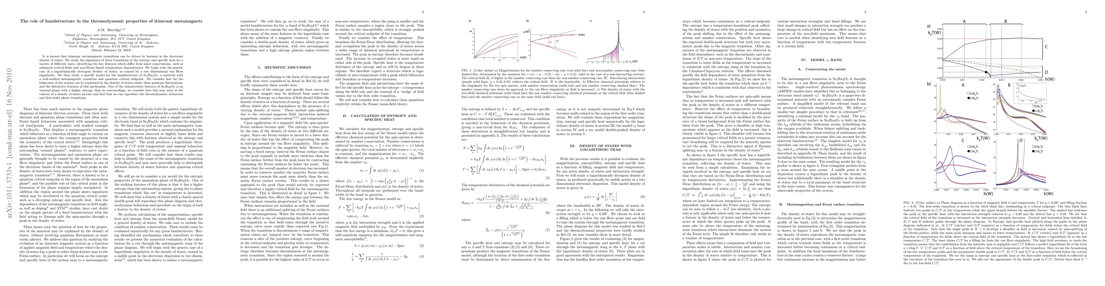 It is known that itinerant metamagnetic transitions can be driven by features in the electronic density of states. We study the signatures of these transitions in the entropy and specific heat for a variety of different cases, identifying the key features which differ from naive expectations, such as enhanced critical fields and non-Fermi liquid temperature dependencies. We begin with the generic case of a logarithmically divergent density of states, as caused by a two dimensional van Hove singularity. We then study a specific model for the bandstructure of Sr3Ru2O7, a material with a well-studied metamagnetic transition and quantum critical endpoint. We consider how far the behaviour of the system can be explained by the density of states rather than quantum fluctuations, and the distinctive features of this mechanism. One of the characteristic features of Sr3Ru2O7 is an unusual phase with a higher entropy than its surroundings, we consider how this may arise in the context of a density of states picture and find that we can reproduce the thermodynamic behaviour and first-order phase transitions.