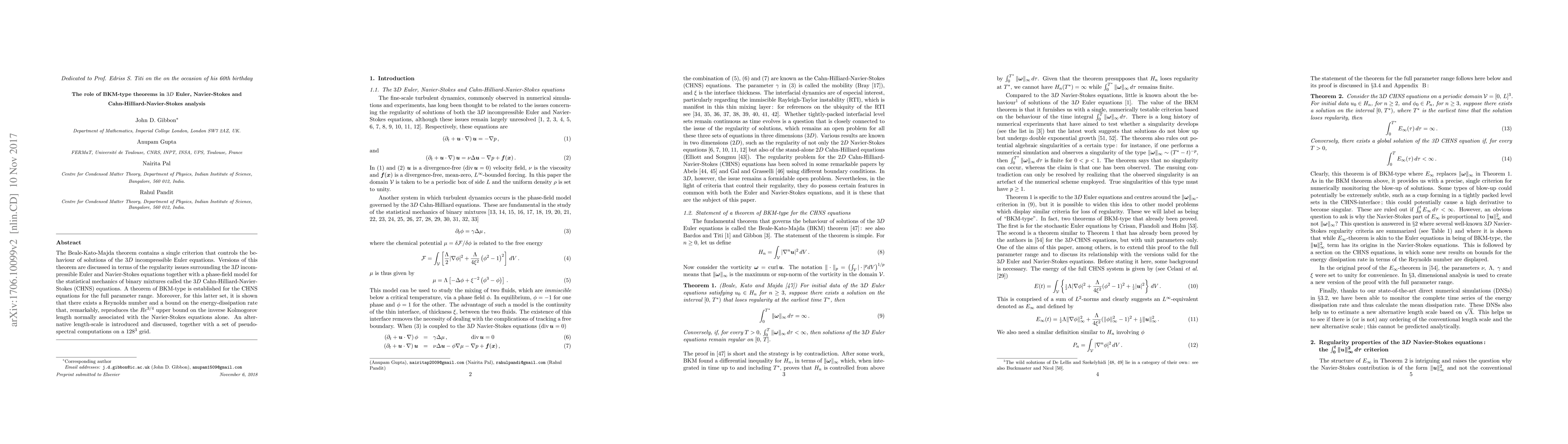 The Beale-Kato-Majda theorem contains a single criterion that controls the behaviour of solutions of the $3D$ incompressible Euler equations. Versions of this theorem are discussed in terms of the regularity issues surrounding the $3D$ incompressible Euler and Navier-Stokes equations together with a phase-field model for the statistical mechanics of binary mixtures called the $3D$ Cahn-Hilliard-Navier-Stokes (CHNS) equations. A theorem of BKM-type is established for the CHNS equations for the full parameter range. Moreover, for this latter set, it is shown that there exists a Reynolds number and a bound on the energy-dissipation rate that, remarkably, reproduces the $Re^{3/4}$ upper bound on the inverse Kolmogorov length normally associated with the Navier-Stokes equations alone. An alternative length-scale is introduced and discussed, together with a set of pseudo-spectral computations on a $128^{3}$ grid.
