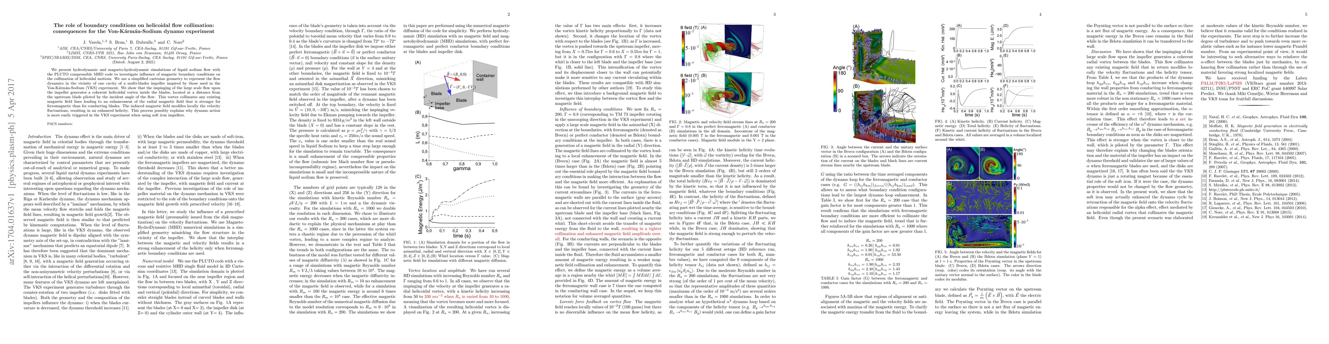 This paper investigates how magnetic boundary conditions influence the collimation of helicoidal flows in liquid sodium using hydrodynamic and magneto-hydrodynamic simulations, revealing that the interaction between large-scale flow and the impeller generates a coherent helicoidal vortex that enhances radial magnetic fields, explaining the easier dynamo action in the Von-Kármán-Sodium experiment with ferromagnetic blades.