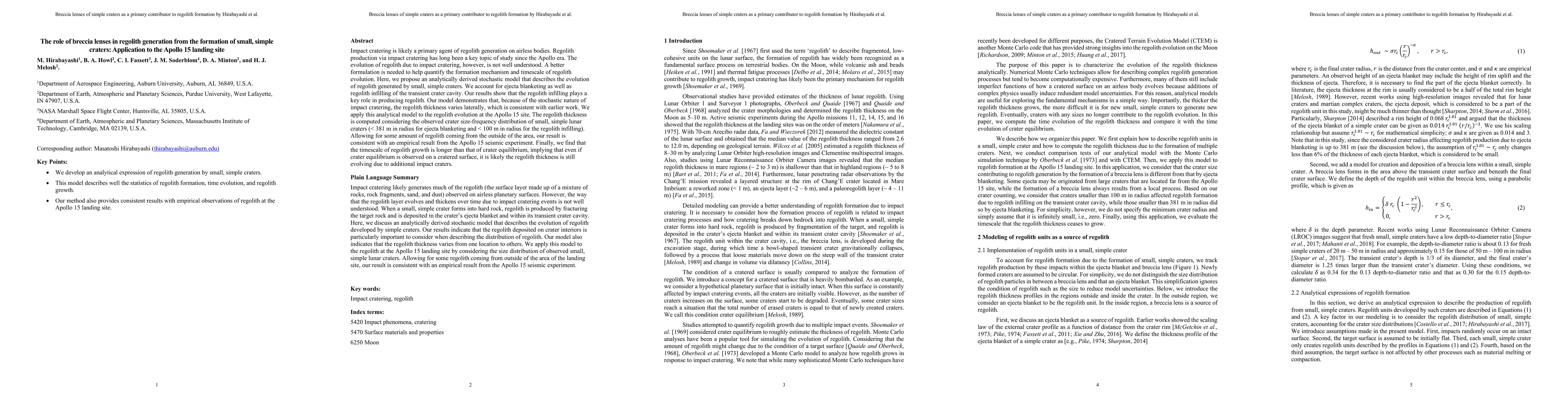 This paper proposes a stochastic model to quantify regolith generation from small, simple craters, emphasizing the role of regolith infilling. The model is applied to the Apollo 15 site, showing that regolith thickness varies laterally and grows over a longer timescale than crater equilibrium, consistent with seismic data.
