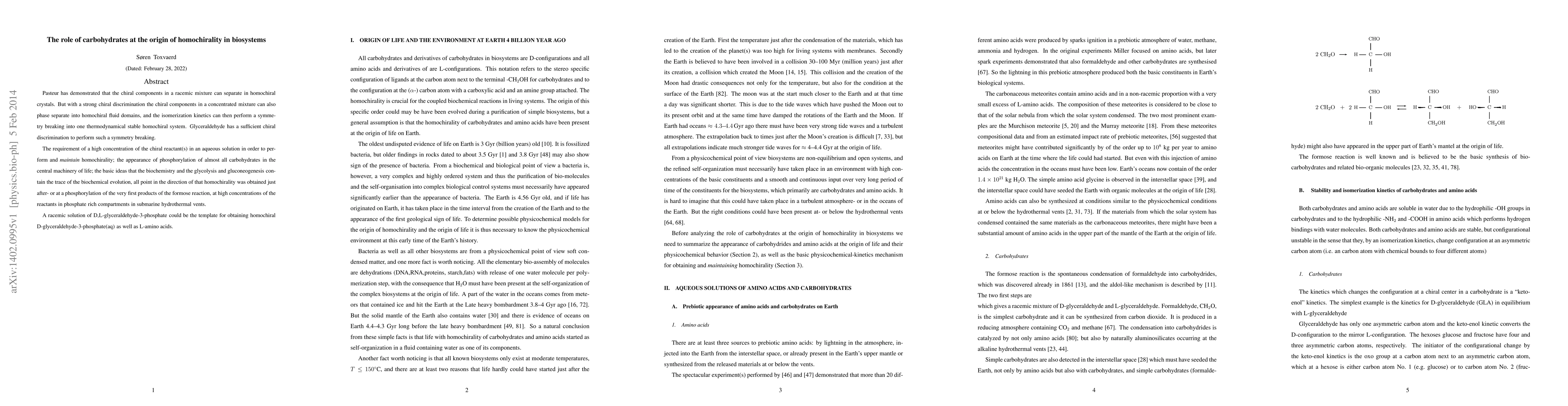 Pasteur has demonstrated that the chiral components in a racemic mixture can separate in homochiral crystals. But with a strong chiral discrimination the chiral components in a concentrated mixture can also phase separate into homochiral fluid domains, and the isomerization kinetics can then perform a symmetry breaking into one thermodynamical stable homochiral system. Glyceraldehyde has a sufficient chiral discrimination to perform such a symmetry breaking. The requirement of a high concentration of the chiral reactant(s) in an aqueous solution in order to perform and $\textit{maintain}$ homochirality; the appearance of phosphorylation of almost all carbohydrates in the central machinery of life; the basic ideas that the biochemistry and the glycolysis and gluconeogenesis contain the trace of the biochemical evolution, all point in the direction of that homochirality was obtained just after- or at a phosphorylation of the very first products of the formose reaction, at high concentrations of the reactants in phosphate rich compartments in submarine hydrothermal vents. A racemic solution of D,L-glyceraldehyde-3-phosphate could be the template for obtaining homochiral D-glyceraldehyde-3-phosphate(aq) as well as L-amino acids.