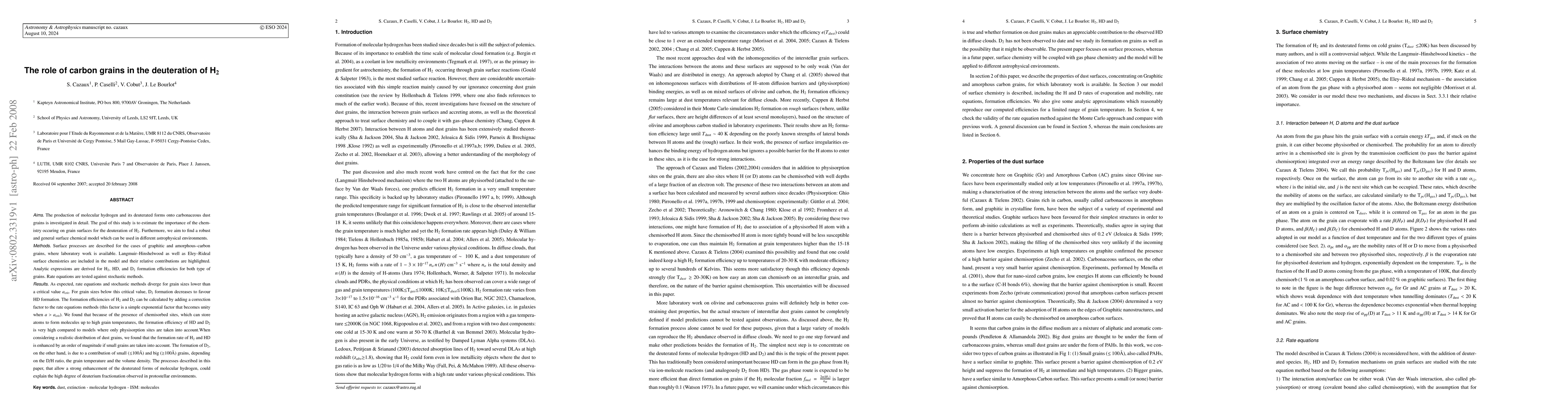 A Monte Carlo simulation was used to model the formation of H2, HD, and D2 molecules on carbonaceous grains.