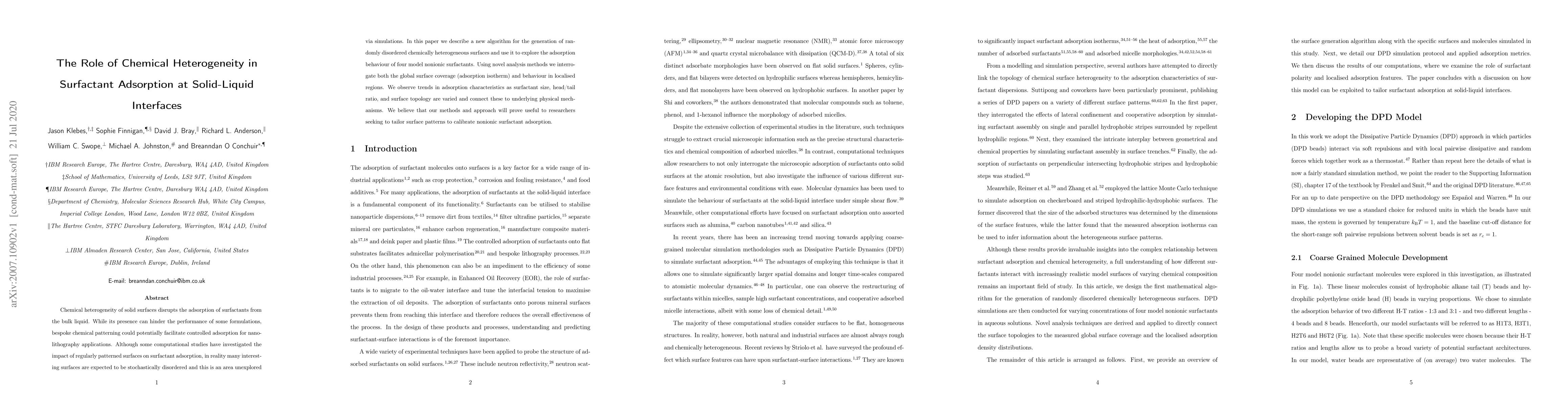 Chemical heterogeneity of solid surfaces disrupts the adsorption of surfactants from the bulk liquid. While its presence can hinder the performance of some formulations, bespoke chemical patterning could potentially facilitate controlled adsorption for nanolithography applications. Although some computational studies have investigated the impact of regularly patterned surfaces on surfactant adsorption, in reality many interesting surfaces are expected to be stochastically disordered and this is an area unexplored via simulations. In this paper we describe a new algorithm for the generation of randomly disordered chemically heterogeneous surfaces and use it to explore the adsorption behaviour of four model nonionic surfactants. Using novel analysis methods we interrogate both the global surface coverage (adsorption isotherm) and behaviour in localised regions. We observe trends in adsorption characteristics as surfactant size, head/tail ratio, and surface topology are varied and connect these to underlying physical mechanisms. We believe that our methods and approach will prove useful to researchers seeking to tailor surface patterns to calibrate nonionic surfactant adsorption.