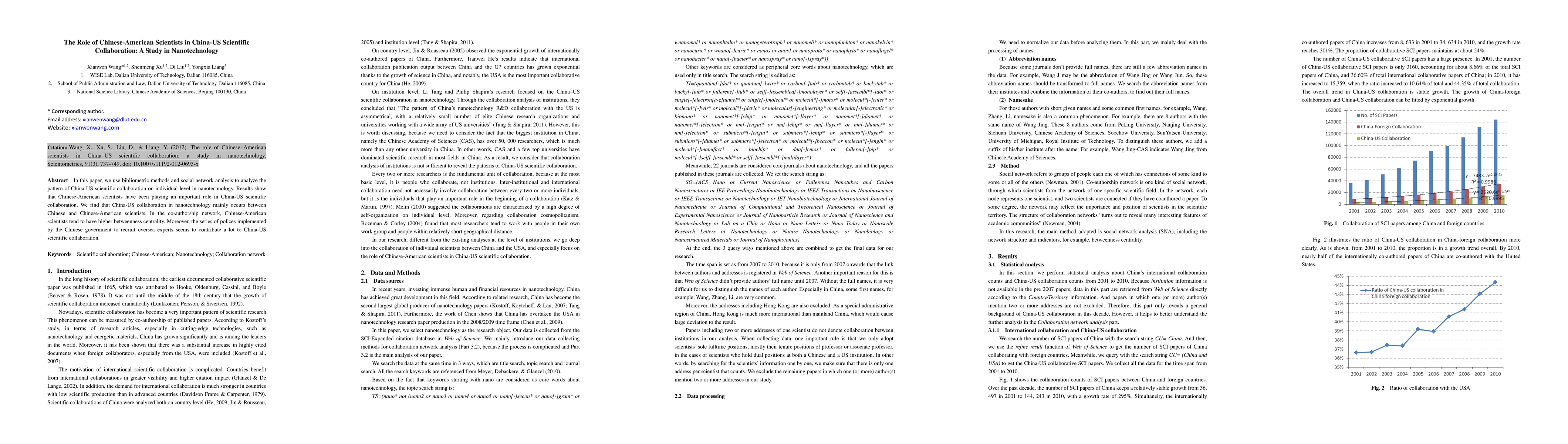 This study employs bibliometric methods and social network analysis to reveal that Chinese-American scientists significantly facilitate China-US scientific collaboration in nanotechnology, often acting as key intermediaries in co-authorship networks. The Chinese government's policies to recruit overseas experts also play a crucial role in fostering this collaboration.