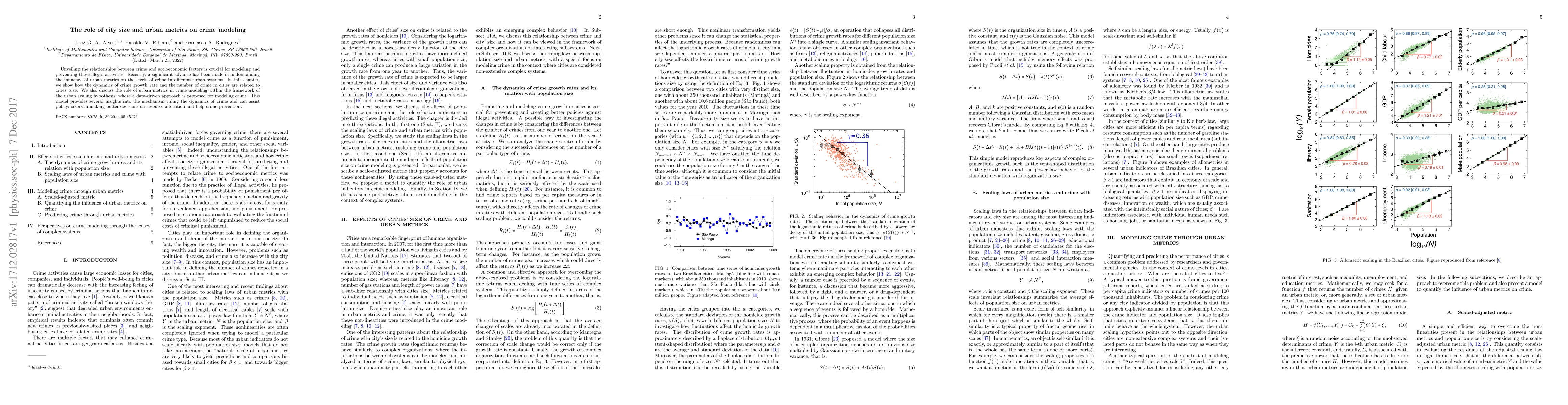 Unveiling the relationships between crime and socioeconomic factors is crucial for modeling and preventing these illegal activities. Recently, a significant advance has been made in understanding the influence of urban metrics on the levels of crime in different urban systems. In this chapter, we show how the dynamics of crime growth rate and the number of crime in cities are related to cities' size. We also discuss the role of urban metrics in crime modeling within the framework of the urban scaling hypothesis, where a data-driven approach is proposed for modeling crime. This model provides several insights into the mechanism ruling the dynamics of crime and can assist policymakers in making better decisions on resource allocation and help crime prevention.