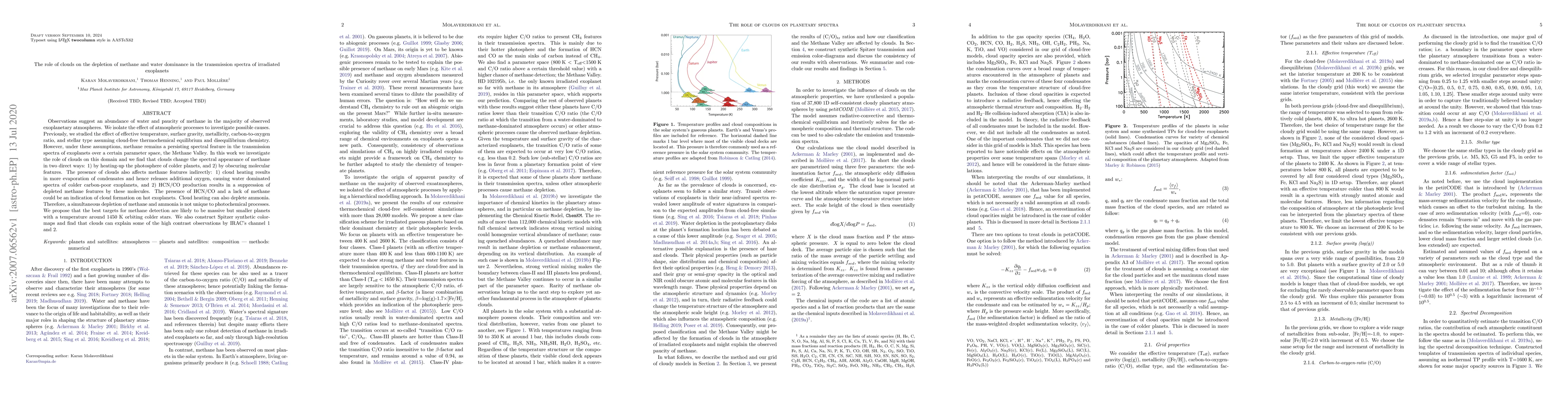 This paper investigates how clouds influence the depletion of methane and water dominance in exoplanet atmospheres, finding that clouds can heat the photosphere and obscure molecular features, leading to water-dominated spectra in colder carbon-poor exoplanets. The presence of HCN/CO and lack of methane may indicate cloud formation on hot exoplanets, suggesting that massive, smaller planets around 1450 K and cooler stars are optimal targets for methane detection.