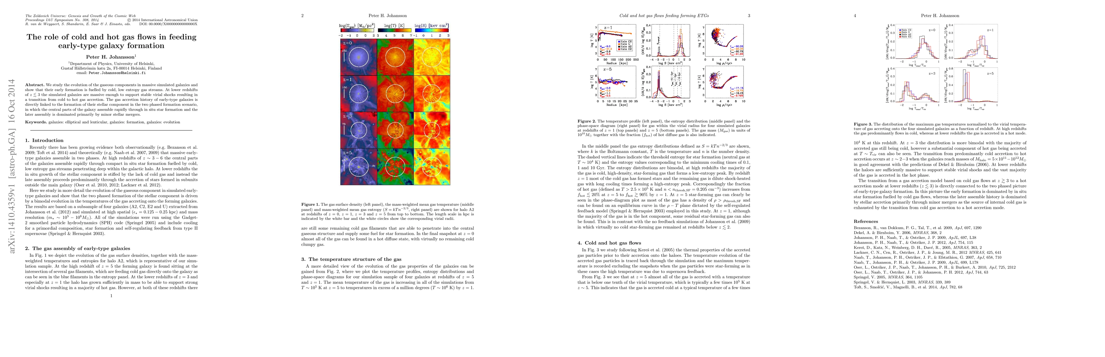We study the evolution of the gaseous components in massive simulated galaxies and show that their early formation is fuelled by cold, low entropy gas streams. At lower redshifts of z<3 the simulated galaxies are massive enough to support stable virial shocks resulting in a transition from cold to hot gas accretion. The gas accretion history of early-type galaxies is directly linked to the formation of their stellar component in the two phased formation scenario, in which the central parts of the galaxy assemble rapidly through in situ star formation and the later assembly is dominated primarily by minor stellar mergers.