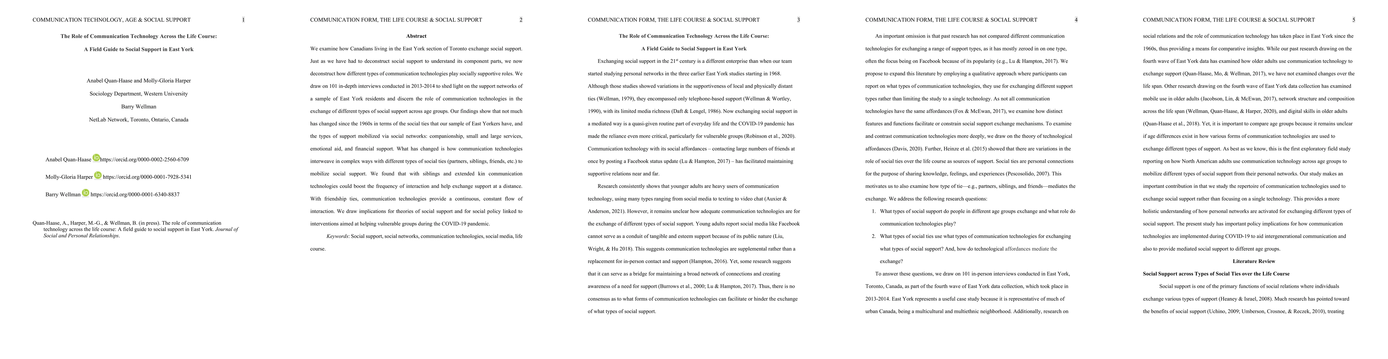 We examine how Canadians living in the East York section of Toronto exchange social support. Just as we have had to deconstruct social support to understand its component parts, we now deconstruct how different types of communication technologies play socially supportive roles. We draw on 101 in-depth interviews conducted in 2013-2014 to shed light on the support networks of a sample of East York residents and discern the role of communication technologies in the exchange of different types of social support across age groups. Our findings show that not much has changed since the 1960s in terms of the social ties that our sample of East Yorkers have, and the types of support mobilized via social networks: companionship, small and large services, emotional aid, and financial support. What has changed is how communication technologies interweave in complex ways with different types of social ties (partners, siblings, friends, etc.) to mobilize social support. We found that with siblings and extended kin communication technologies could boost the frequency of interaction and help exchange support at a distance. With friendship ties, communication technologies provide a continuous, constant flow of interaction. We draw implications for theories of social support and for social policy linked to interventions aimed at helping vulnerable groups during the COVID-19 pandemic.