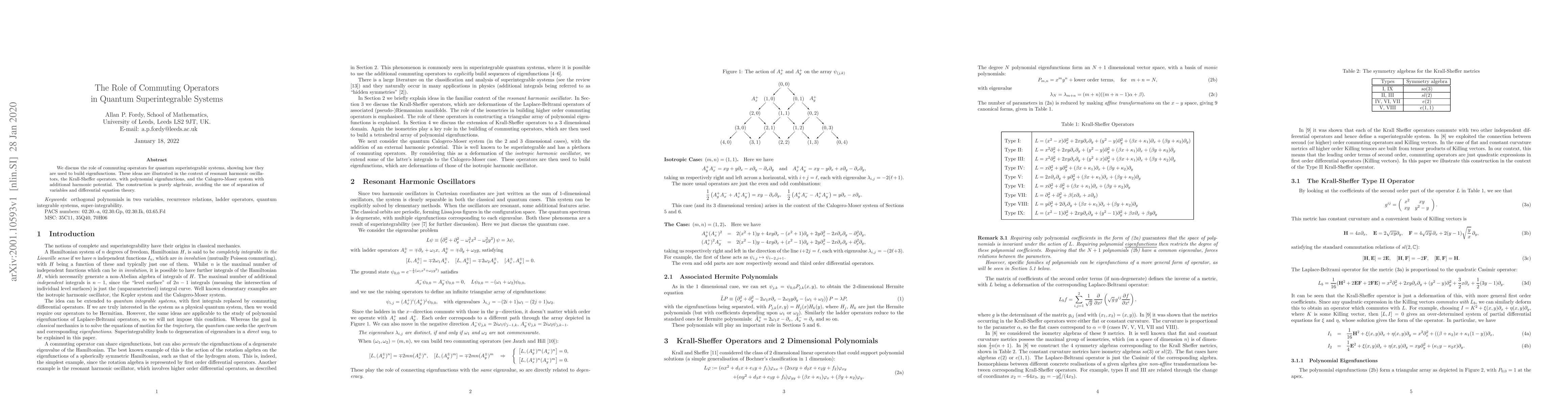 This paper explores the use of commuting operators in quantum superintegrable systems to construct eigenfunctions, illustrated through resonant harmonic oscillators, Krall-Sheffer operators, and the Calogero-Moser system, employing purely algebraic methods.