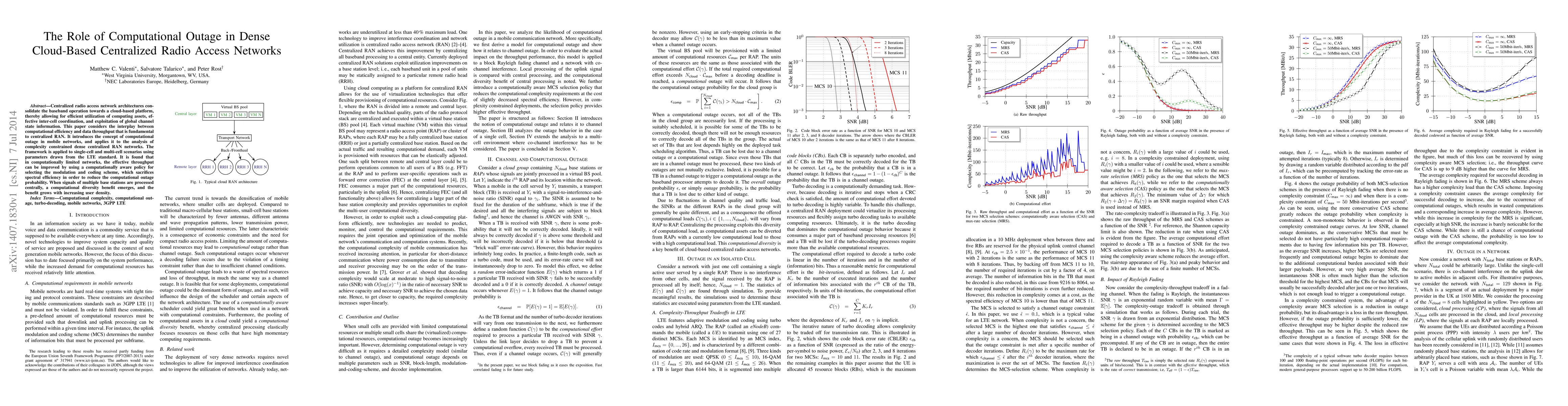Centralized radio access network architectures consolidate the baseband operation towards a cloud-based platform, thereby allowing for efficient utilization of computing assets, effective inter-cell coordination, and exploitation of global channel state information. This paper considers the interplay between computational efficiency and data throughput that is fundamental to centralized RAN. It introduces the concept of computational outage in mobile networks, and applies it to the analysis of complexity constrained dense centralized RAN networks. The framework is applied to single-cell and multi-cell scenarios using parameters drawn from the LTE standard. It is found that in computationally limited networks, the effective throughput can be improved by using a computationally aware policy for selecting the modulation and coding scheme, which sacrifices spectral efficiency in order to reduce the computational outage probability. When signals of multiple base stations are processed centrally, a computational diversity benefit emerges, and the benefit grows with increasing user density.