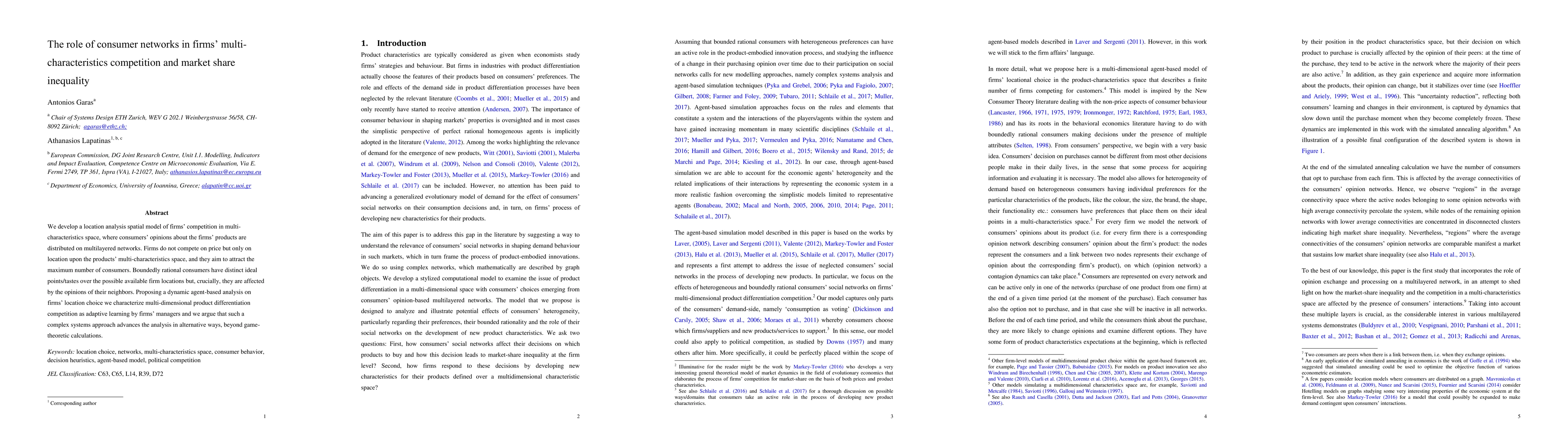 This paper develops a spatial model to analyze firms' competition in a multi-characteristics space, where consumers' preferences are influenced by their network connections. It proposes a dynamic agent-based approach to understand firms' adaptive learning strategies in product differentiation, emphasizing the role of consumer networks in shaping market-share inequality.