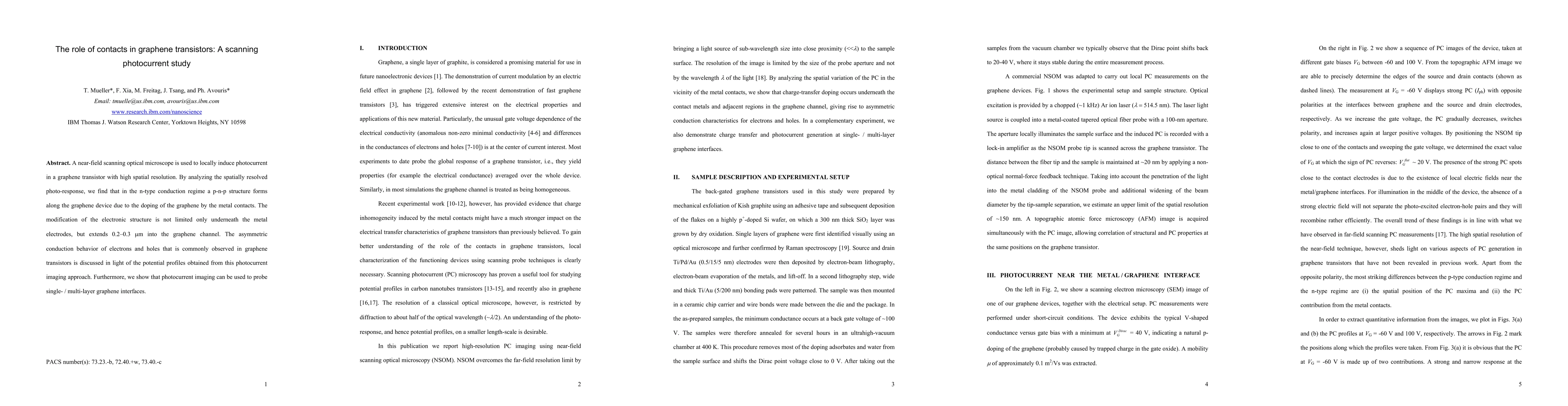 This study uses a scanning photocurrent technique to investigate the impact of metal contacts on graphene transistors, revealing a p-n-p structure formation due to doping. The study finds that electronic structure modifications extend beyond the metal electrodes, influencing the transistor's asymmetric conduction behavior.