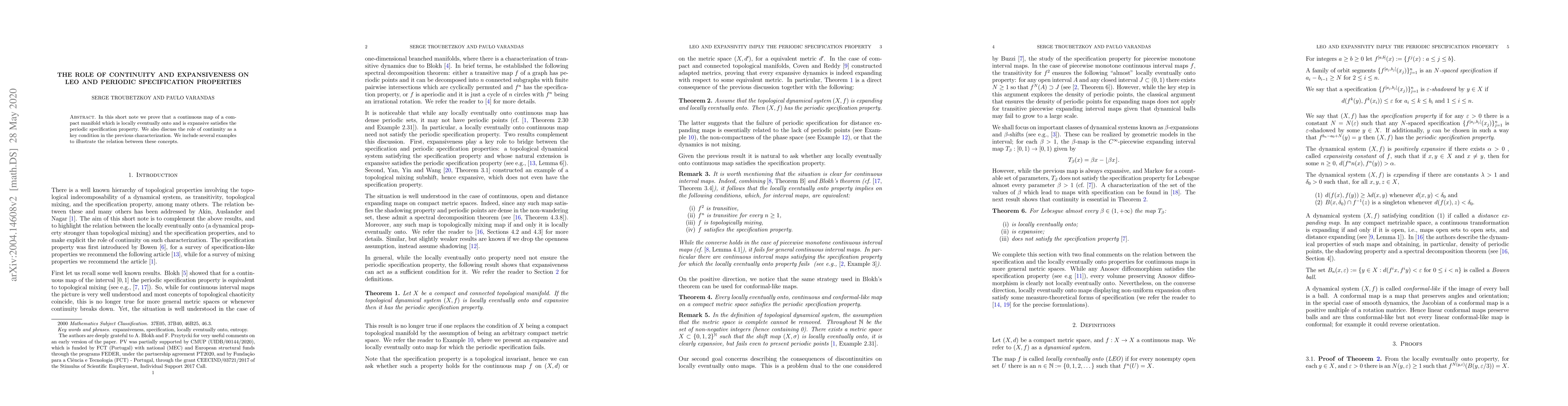 In this short note we prove that a continuous map which is locally eventually onto and is expansive satisfies the periodic specification property. We also discuss the role of continuity as a key condition in the previous characterization. We include several examples to illustrate the relation between these concepts.