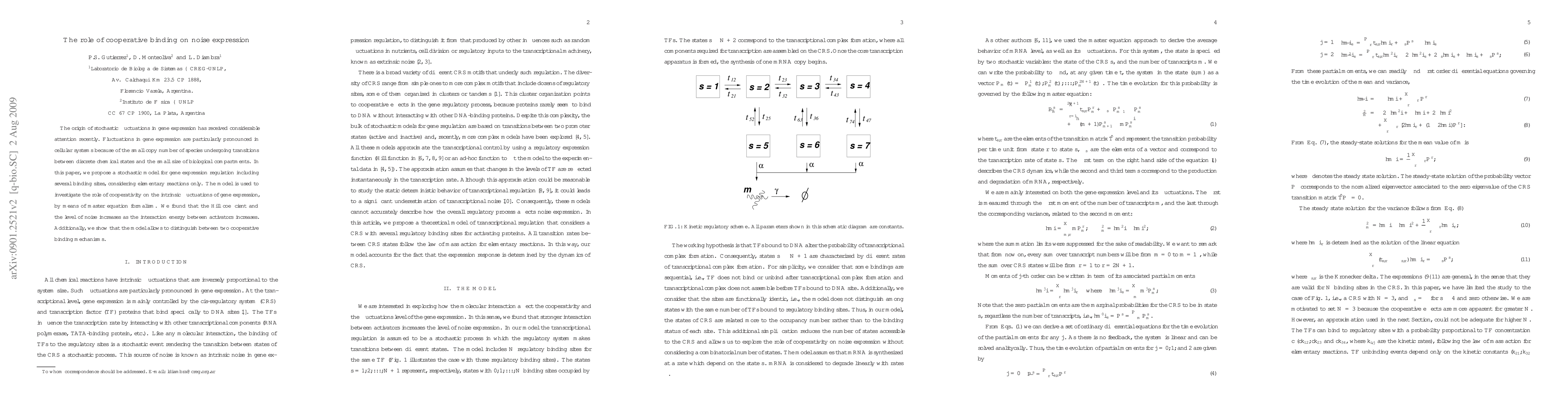 This paper explores a stochastic model of gene expression regulation with multiple binding sites, using master equation formalism to analyze how cooperative binding influences intrinsic noise. The study finds that increased interaction energy between activators raises both the Hill coefficient and noise levels, and distinguishes between two cooperative binding mechanisms.