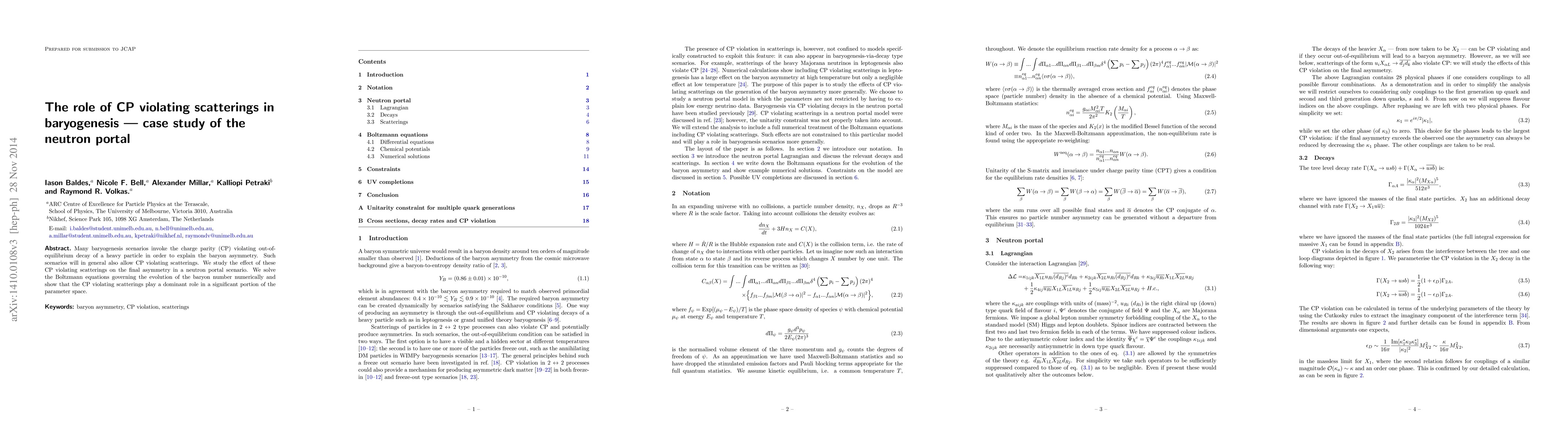 This paper investigates the impact of CP violating scatterings in baryogenesis within a neutron portal scenario, demonstrating through numerical solutions of Boltzmann equations that these scatterings significantly influence the final baryon asymmetry in a substantial portion of the parameter space.