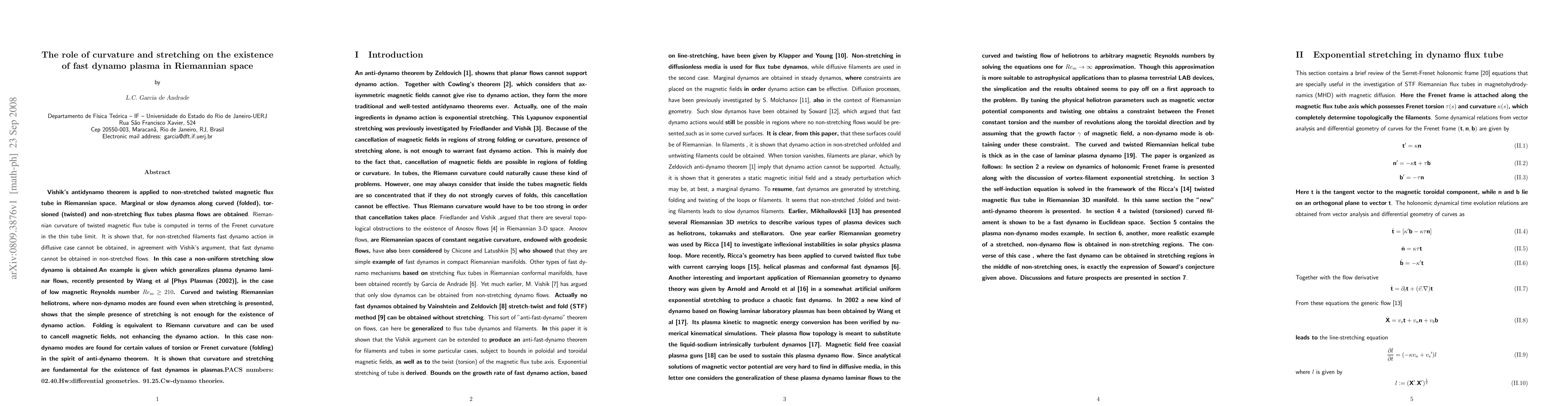 This paper explores the influence of curvature and stretching on dynamo action in plasmas, applying Vishik's antidynamo theorem to non-stretched twisted magnetic flux tubes. The study finds that non-stretched filaments cannot support fast dynamo action, but can exhibit slow dynamo behavior, emphasizing the necessity of both curvature and stretching for fast dynamo action in plasmas.