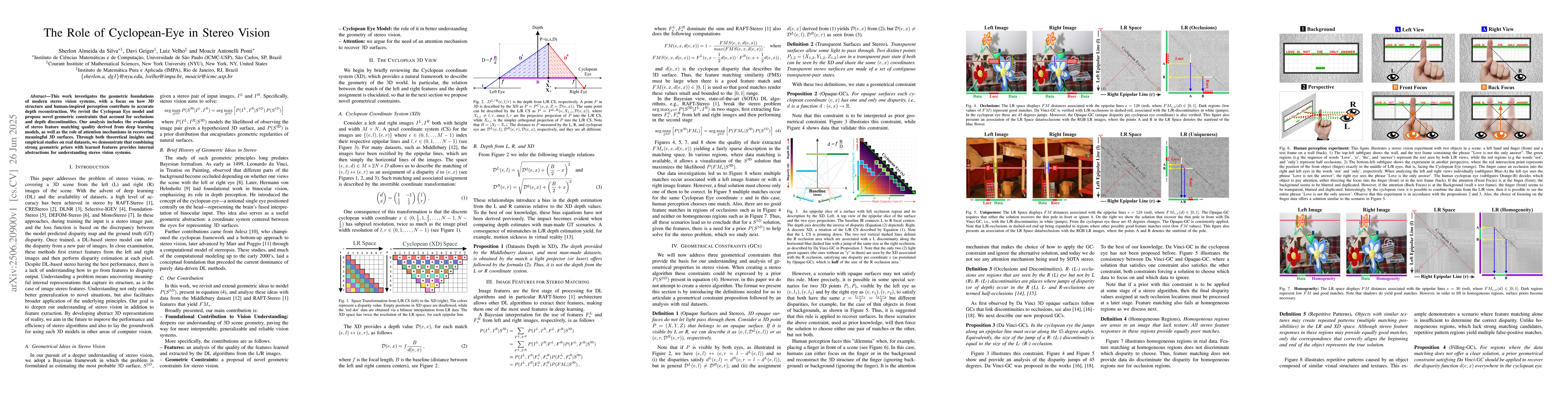 This research explores the Cyclopean Eye model to enhance stereo vision systems, proposing new geometric constraints for handling occlusions and depth discontinuities. It shows that merging robust geometric priors with learned features improves 3D structure reconstruction and depth perception.