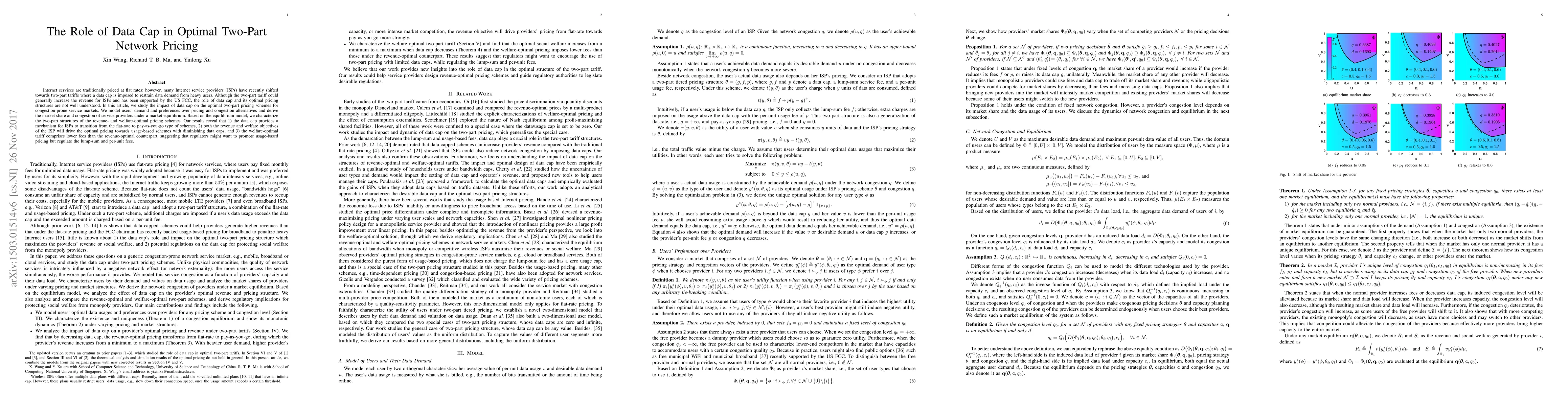 Internet services are traditionally priced at flat rates; however, many Internet service providers (ISPs) have recently shifted towards two-part tariffs where a data cap is imposed to restrain data demand from heavy users. Although the two-part tariff could generally increase the revenue for ISPs and has been supported by the US FCC, the role of data cap and its optimal pricing structures are not well understood. In this article, we study the impact of data cap on the optimal two-part pricing schemes for congestion-prone service markets. We model users' demand and preferences over pricing and congestion alternatives and derive the market share and congestion of service providers under a market equilibrium. Based on the equilibrium model, we characterize the two-part structures of the revenue- and welfare-optimal pricing schemes. Our results reveal that 1) the data cap provides a mechanism for ISPs to transition from the flat-rate to pay-as-you-go type of schemes, 2) both the revenue and welfare objectives of the ISP will drive the optimal pricing towards usage-based schemes with diminishing data caps, and 3) the welfare-optimal tariff comprises lower fees than the revenue-optimal counterpart, suggesting that regulators might want to promote usage-based pricing but regulate the lump-sum and per-unit fees.