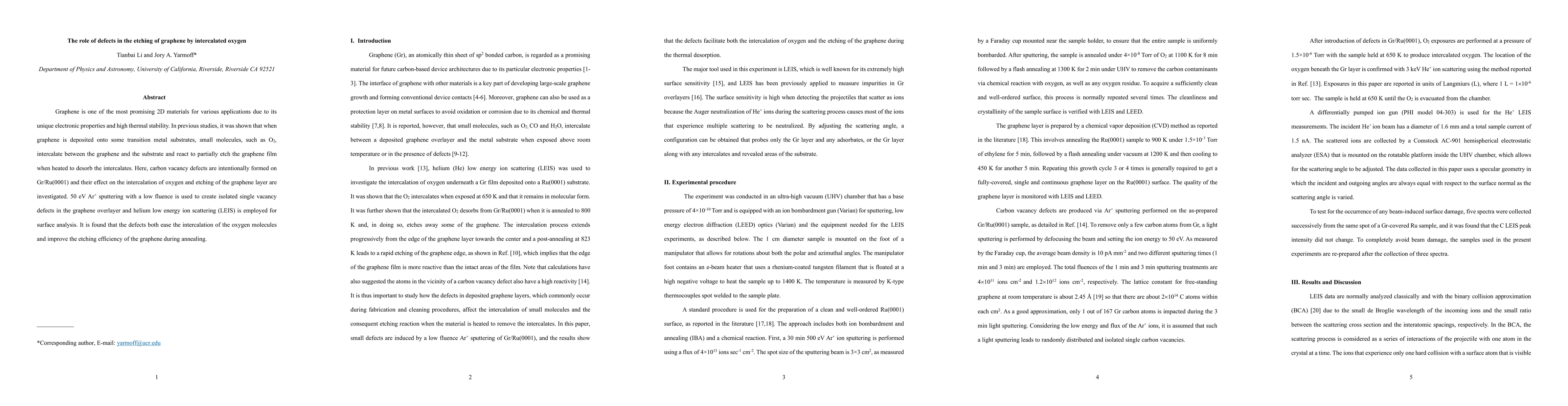 Graphene is one of the most promising 2D materials for various applications due to its unique electronic properties and high thermal stability. In previous studies, it was shown that when graphene is deposited onto some transition metal substrates, small molecules, such as O$_2$, intercalate between the graphene and the substrate and react to partially etch the graphene film when heated to desorb the intercalates. Here, carbon vacancy defects are intentionally formed on Gr/Ru(0001) and their effect on the intercalation of oxygen and etching of the graphene layer are investigated. 50 eV Ar$^+$ sputtering with a low fluence is used to create isolated single vacancy defects in the graphene overlayer and helium low energy ion scattering (LEIS) is employed for surface analysis. It is found that the defects both ease the intercalation of the oxygen molecules and improve the etching efficiency of the graphene during annealing.
