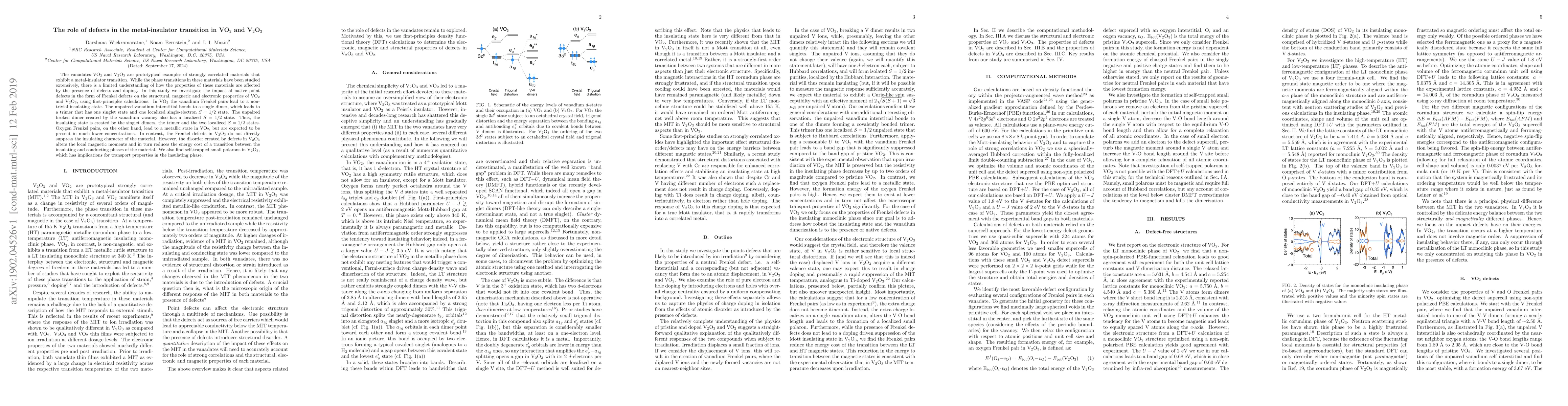 This study investigates how Frenkel defects affect the metal-insulator transition in VO$_2$ and V$_2$O$_3$. In VO$_2$, vanadium Frenkel pairs create localized $S=1/2$ states, leading to an insulating state, while oxygen Frenkel pairs induce metallic behavior. In V$_2$O$_3$, defects alter local magnetic moments, reducing the energy cost for phase transitions and forming self-trapped small polarons impacting transport properties.
