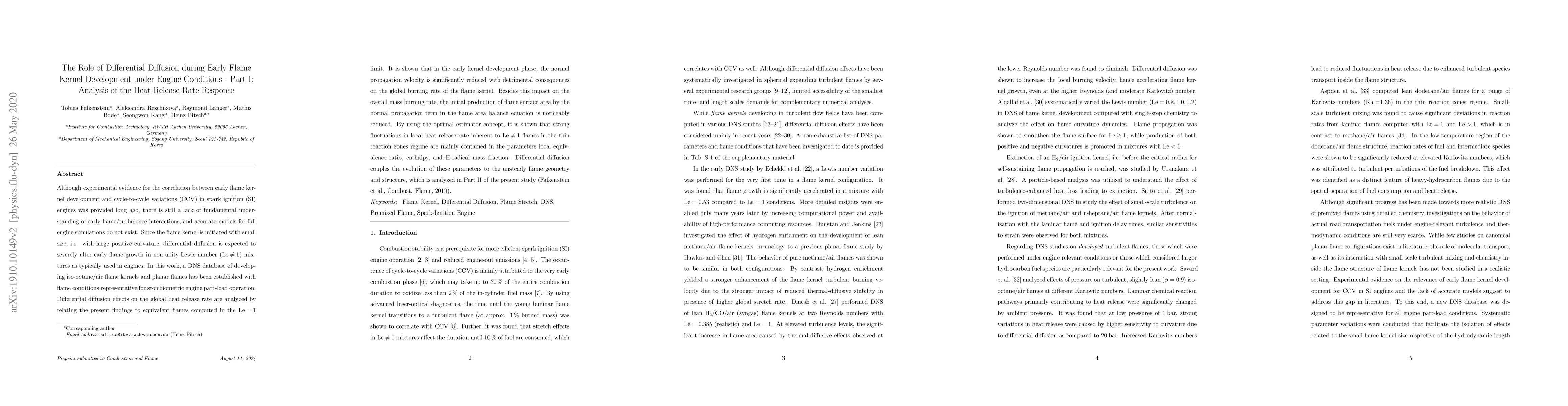 Although experimental evidence for the correlation between early flame kernel development and cycle-to-cycle variations (CCV) in spark ignition (SI) engines was provided long ago, there is still a lack of fundamental understanding of early flame/turbulence interactions, and accurate models for full engine simulations do not exist. Since the flame kernel is initiated with small size, i.e. with large positive curvature, differential diffusion is expected to severely alter early flame growth in non-unity-Lewis-number (${\mathrm{Le}\neq1}$) mixtures as typically used in engines. In this work, a DNS database of developing iso-octane/air flame kernels and planar flames has been established with flame conditions representative for stoichiometric engine part-load operation. Differential diffusion effects on the global heat release rate are analyzed by relating the present findings to equivalent flames computed in the ${\mathrm{Le}=1}$ limit. It is shown that in the early kernel development phase, the normal propagation velocity is significantly reduced with detrimental consequences on the global burning rate of the flame kernel. Besides this impact on the overall mass burning rate, the initial production of flame surface area by the normal propagation term in the flame area balance equation is noticeably reduced. By using the optimal estimator concept, it is shown that strong fluctuations in local heat release rate inherent to ${\mathrm{Le}\neq1}$ flames in the thin reaction zones regime are mainly contained in the parameters local equivalence ratio, enthalpy, and H-radical mass fraction. Differential diffusion couples the evolution of these parameters to the unsteady flame geometry and structure, which is analyzed in Part II of the present study (Falkenstein et al., Combust. Flame, 2019).