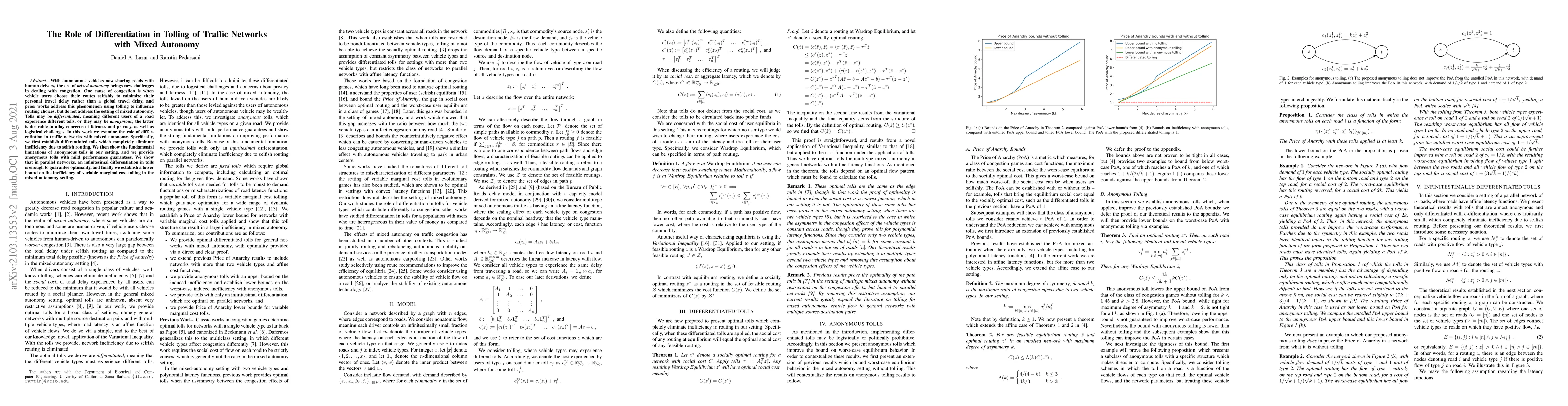 This research extends existing work on tolling in traffic networks by considering mixed autonomy, providing novel insights into the role of differentiation in tolling, and addressing the limitations of anonymous tolling in this context.