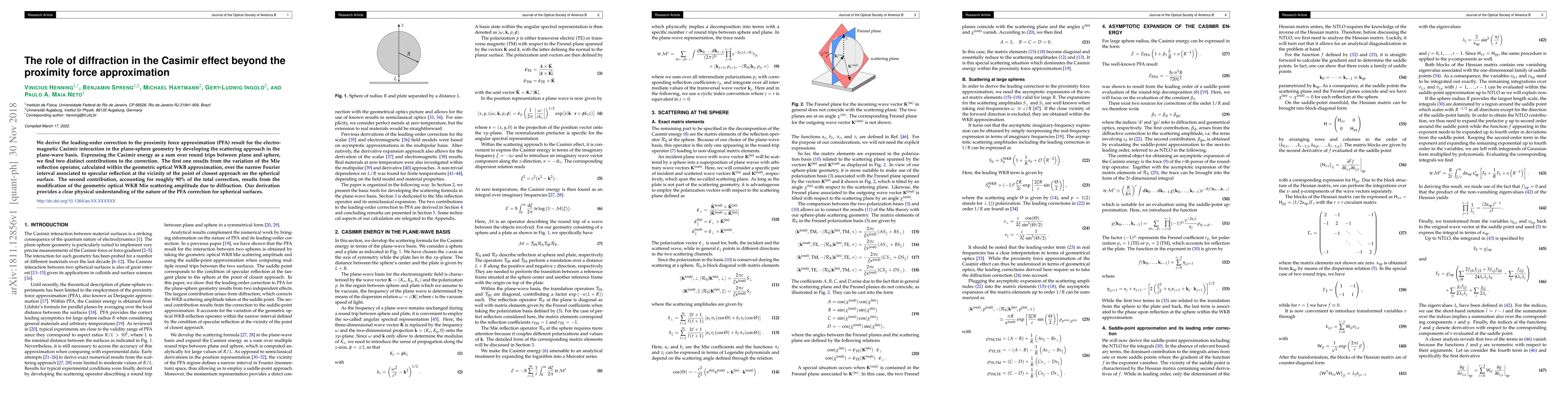 This paper derives the leading-order correction to the proximity force approximation for the Casimir effect in plane-sphere geometry using a scattering approach. It identifies two main contributions: one from Mie reflection variations and the other, larger, from diffraction effects on the Mie scattering amplitude.