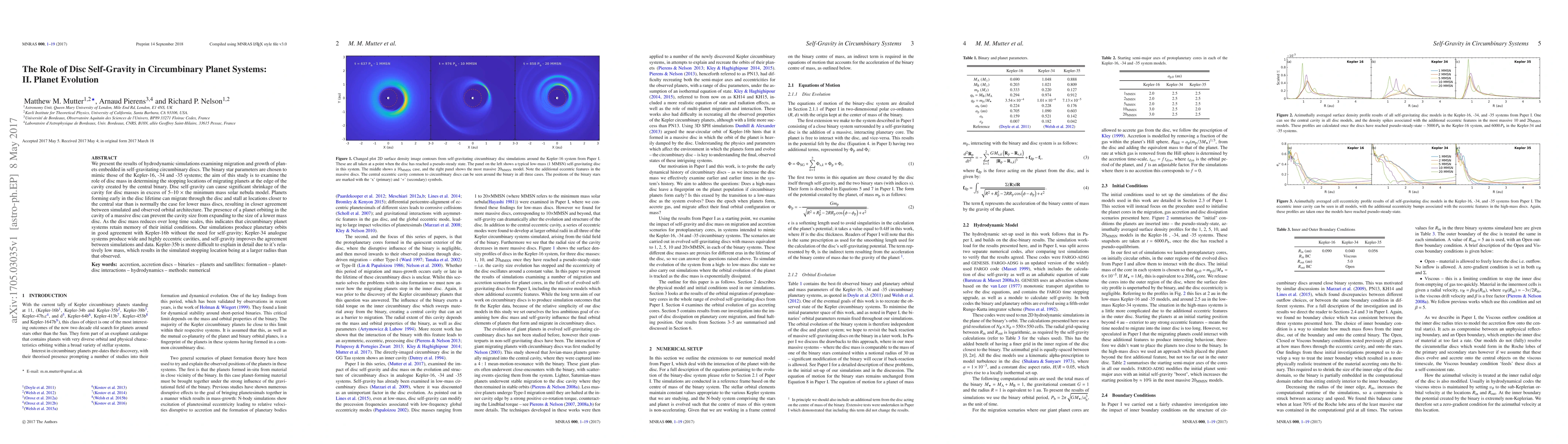 We present the results of hydrodynamic simulations examining migration and growth of planets embedded in self-gravitating circumbinary discs. The binary star parameters are chosen to mimic those of the Kepler-16, -34 and -35 systems; the aim of this study is to examine the role of disc mass in determining the stopping locations of migrating planets at the edge of the cavity created by the central binary. Disc self-gravity can cause significant shrinkage of the cavity for disc masses in excess of 5--10 $\times$ the minimum mass solar nebula model. Planets forming early in the disc lifetime can migrate through the disc and stall at locations closer to the central star than is normally the case for lower mass discs, resulting in closer agreement between simulated and observed orbital architecture. The presence of a planet orbiting in the cavity of a massive disc can prevent the cavity size from expanding to the size of a lower mass disc. As the disc mass reduces over long time scales, this indicates that circumbinary planet systems retain memory of their initial conditions. Our simulations produce planetary orbits in good agreement with Kepler-16b without the need for self-gravity; Kepler-34 analogue systems produce wide and highly eccentric cavities, and self-gravity improves the agreement between simulations and data. Kepler-35b is more difficult to explain in detail due to it's relatively low mass, which results in the simulated stopping location being at a larger radius than that observed.