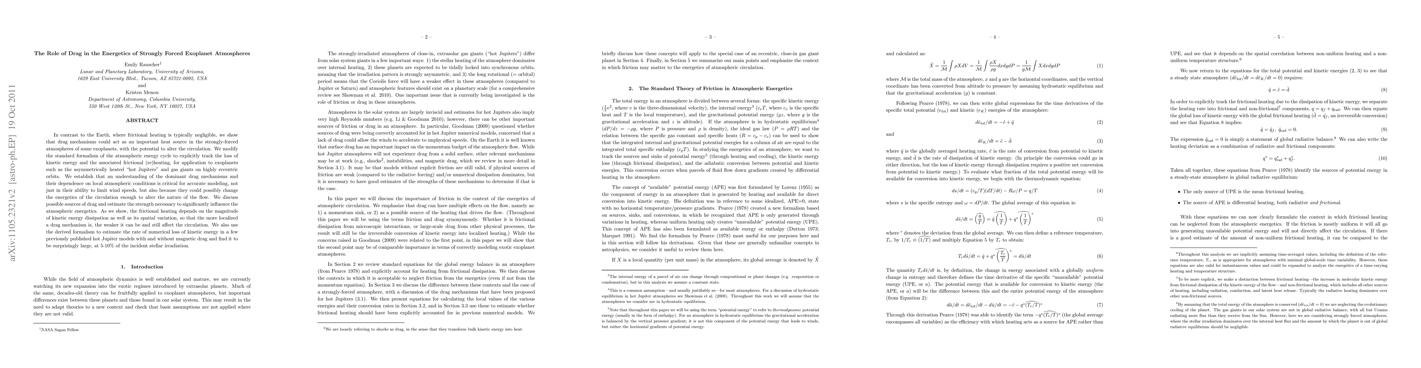 This paper investigates how drag mechanisms can serve as significant heat sources in the atmospheres of strongly forced exoplanets, particularly "hot Jupiters," altering their circulation dynamics. It modifies the atmospheric energy cycle to account for kinetic energy dissipation and frictional heating, emphasizing the importance of understanding drag mechanisms for accurate modeling.