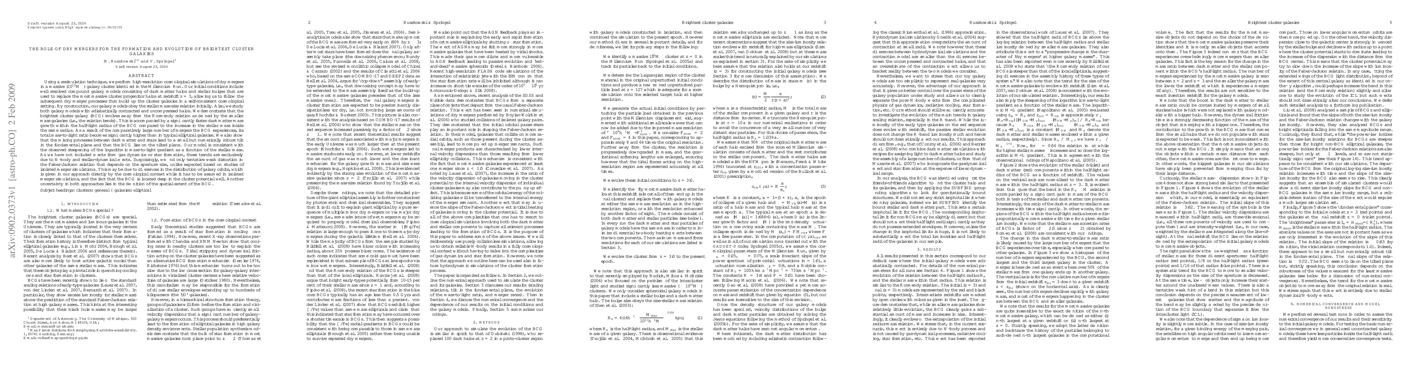 Using a resimulation technique, we perform high-resolution cosmological simulations of dry mergers in a massive galaxy cluster identified in the Millennium Run. Our initial conditions include well resolved compound galaxy models consisting of dark matter halos and stellar bulges that are used to replace the most massive cluster progenitor halos at redshift z=3. By construction, our galaxy models obey the stellar mass-size relation initially. We demonstrate that the brightest cluster galaxy (BCG) evolves away from the Kormendy relation as defined by the smaller mass galaxies (i.e., the relation bends). As a result of the comparatively large number of mergers the BCG experiences, its total mass-to-light ratio becomes significantly higher than in typical elliptical galaxies. We also show that the mixing processes between dark matter and stars lead to a small but numerically robust tilt in the fundamental plane and that the BCG lies on the tilted plane. Our model is consistent with the observed steepening of the logarithmic mass-to-light gradient as a function of the stellar mass. Surprisingly, we find only tentative weak distortion in the Faber-Jackson relation that depends on the aperture size, unlike expected based on studies of isolated merger simulations. This may be due to differences in the distribution of galaxy orbits, which is given in our approach directly by the cosmological context while it has to be assumed in isolated merger simulations, and the fact that the BCG is located deep in the cluster potential well.