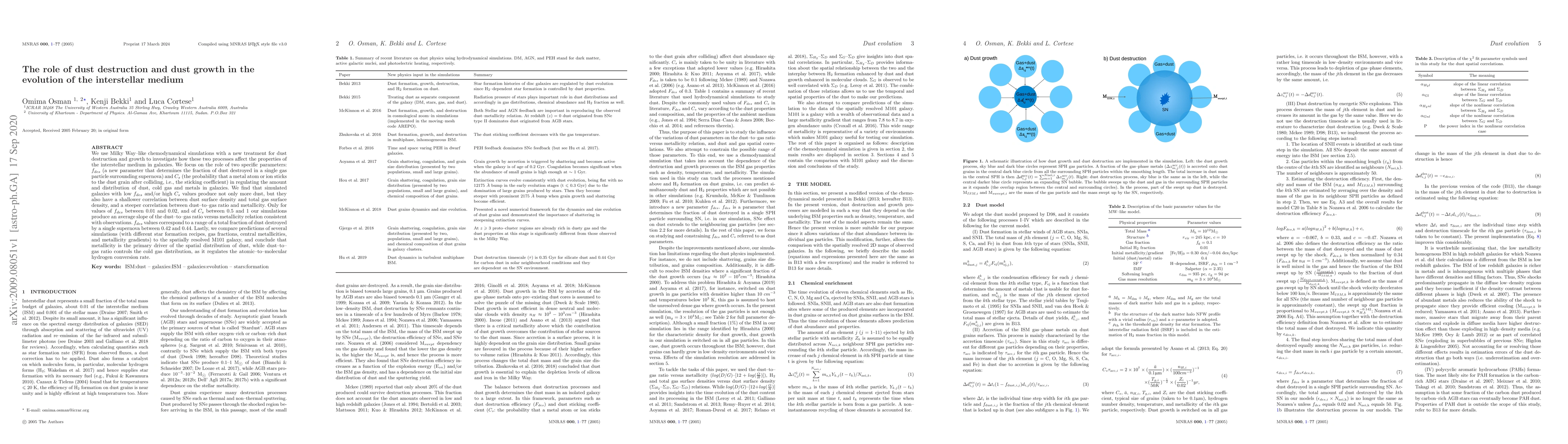 This paper explores the impact of dust destruction and growth on the interstellar medium's properties using Milky Way-like chemodynamical simulations. It finds that low dust destruction and high sticking coefficients lead to more dust and altered correlations between dust, gas, and metallicity, with optimal parameter values matching observations. Metallicity primarily drives dust distribution, while the dust-to-gas ratio influences cold gas distribution.