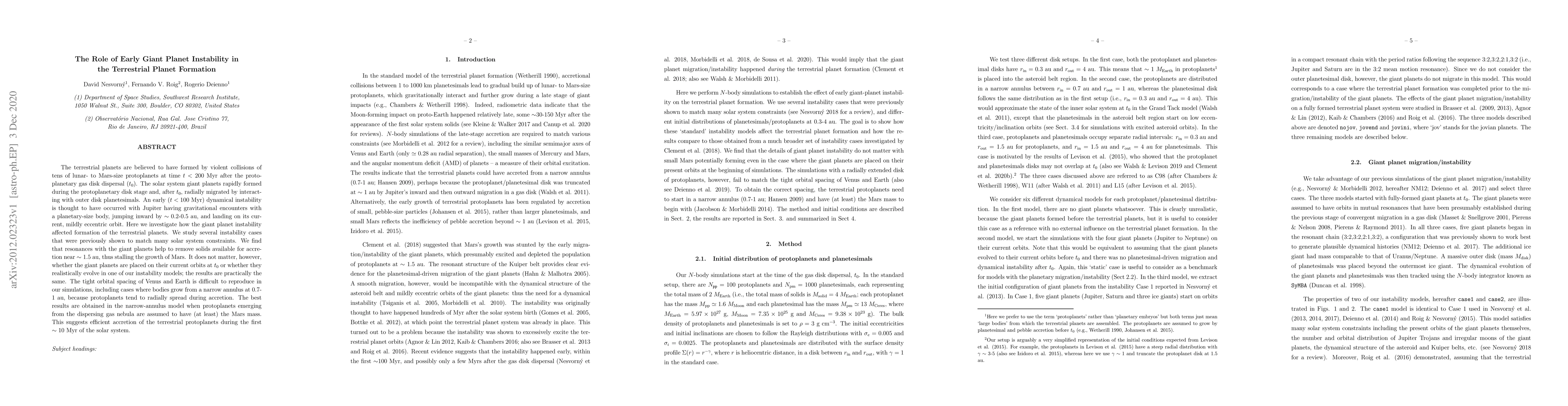 This paper explores how early giant planet instability impacts terrestrial planet formation, finding that giant planet resonances hinder Mars growth by removing solids near 1.5 au. Despite variations in giant planet migration, the results remain consistent, but tight orbital spacing of Venus and Earth is hard to reproduce due to radial spreading during accretion.