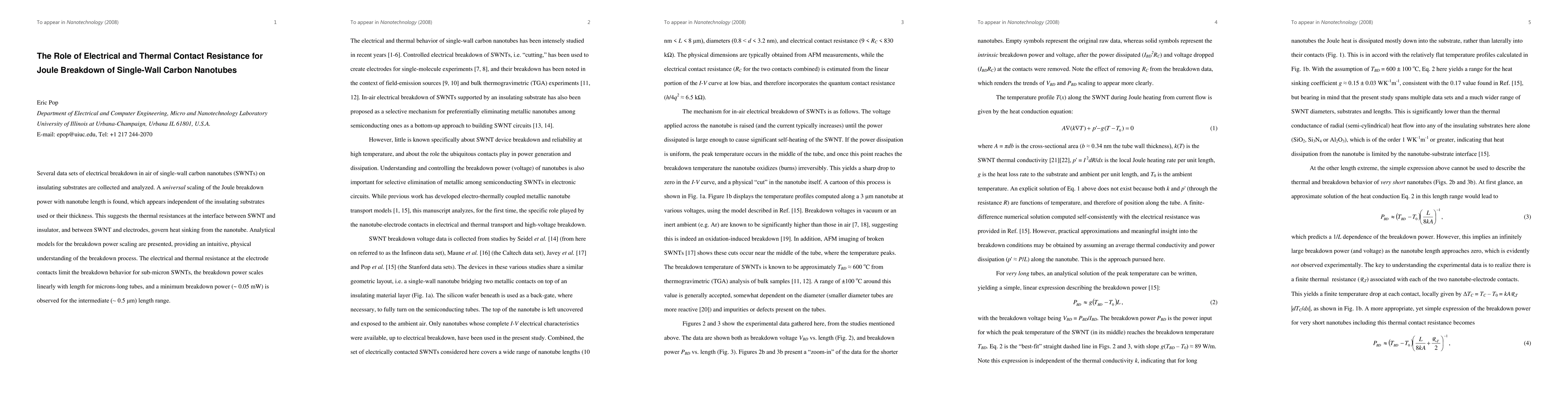 Several data sets of electrical breakdown in air of single-wall carbon nanotubes (SWNTs) on insulating substrates are collected and analyzed. A universal scaling of the Joule breakdown power with nanotube length is found, which appears independent of the insulating substrates used or their thickness. This suggests the thermal resistances at the interface between SWNT and insulator, and between SWNT and electrodes, govern heat sinking from the nanotube. Analytical models for the breakdown power scaling are presented, providing an intuitive, physical understanding of the breakdown process. The electrical and thermal resistance at the electrode contacts limit the breakdown behavior for sub-micron SWNTs, the breakdown power scales linearly with length for microns-long tubes, and a minimum breakdown power (~ 0.05 uW) is observed for the intermediate (~ 0.5 um) length range.