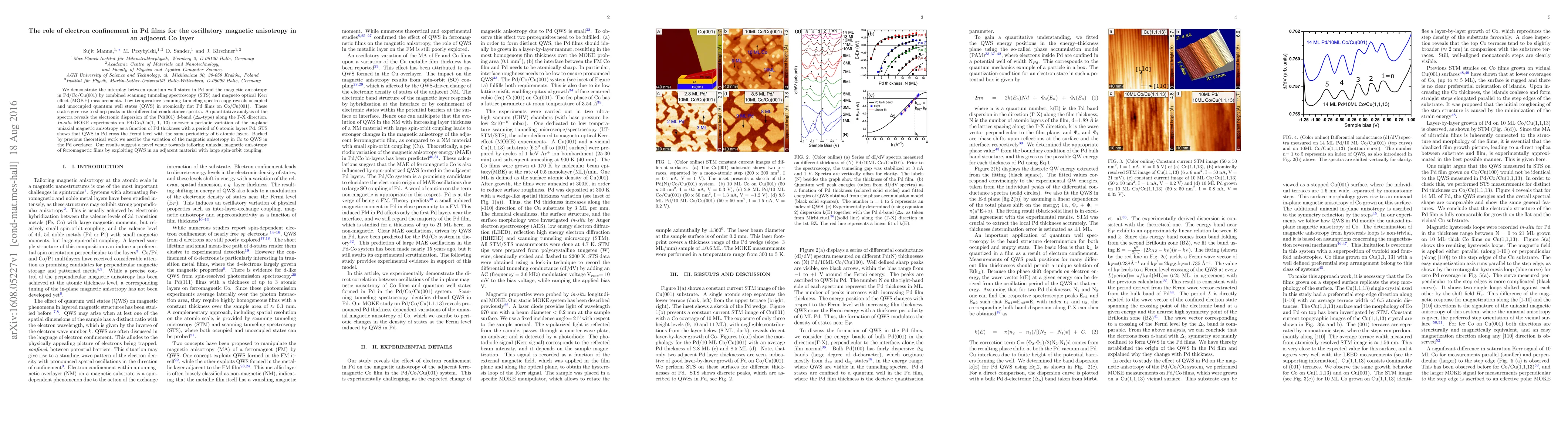 This study investigates the influence of quantum well states in Pd films on the oscillatory magnetic anisotropy in adjacent Co layers using STS and MOKE. The findings reveal a periodic variation in Co's magnetic anisotropy correlated with Pd's quantum well states, suggesting a method to control magnetic properties via spin-orbit coupling.