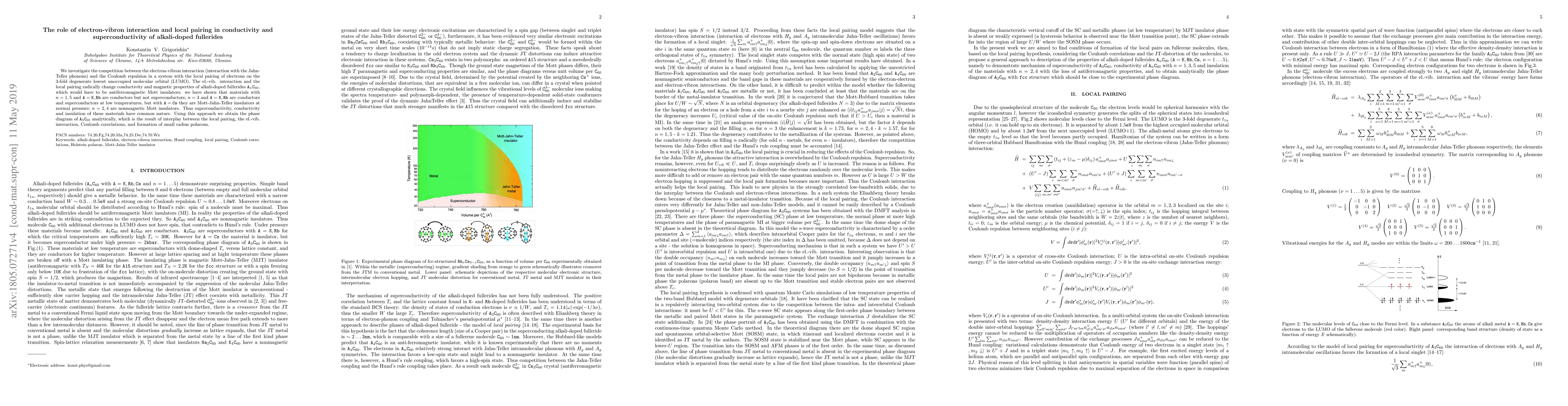 We investigate the competition between the electron-vibron interaction (interaction with the Jahn-Teller phonons) and the Coulomb repulsion in a system with the local pairing of electrons on the 3-fold degenerate lowest unoccupied molecular orbital (LUMO). The el.-vib. interaction and the local pairing radically change conductivity and magnetic properties of alkali-doped fullerides $\texttt{A}_{n}\texttt{C}_{60}$, which would have to be antiferromagnetic Mott insulators: we have shown that materials with $n=1,5$ and $\texttt{A}=\texttt{K},\texttt{Rb}$ are conductors but not superconductors; $n=3$ and $\texttt{A}=\texttt{K},\texttt{Rb}$ are conductors and superconductors at low temperatures, but with $\texttt{A}=\texttt{Cs}$ they are Mott-Jahn-Teller insulators at normal pressure; $n=2,4$ are nonmagnetic Mott insulators. Thus superconductivity, conductivity and insulation of these materials have common nature. Using this approach we obtain the phase diagram of $\texttt{A}_{3}\texttt{C}_{60}$ analytically, which is the result of interplay between the local pairing, the el.-vib. interaction, Coulomb correlations, and formation of small radius polarons.