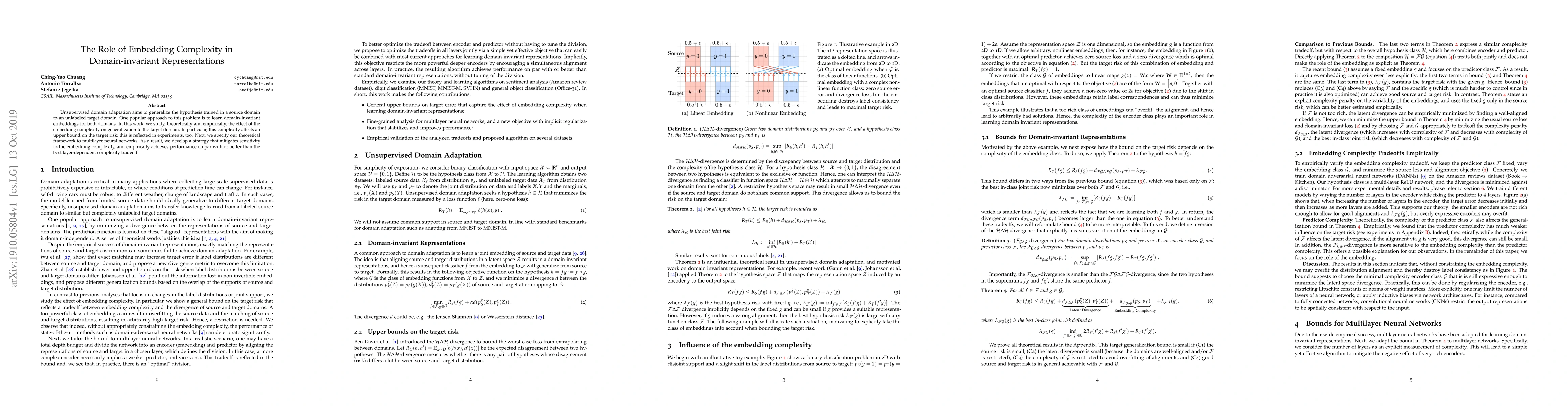 Unsupervised domain adaptation aims to generalize the hypothesis trained in a source domain to an unlabeled target domain. One popular approach to this problem is to learn domain-invariant embeddings for both domains. In this work, we study, theoretically and empirically, the effect of the embedding complexity on generalization to the target domain. In particular, this complexity affects an upper bound on the target risk; this is reflected in experiments, too. Next, we specify our theoretical framework to multilayer neural networks. As a result, we develop a strategy that mitigates sensitivity to the embedding complexity, and empirically achieves performance on par with or better than the best layer-dependent complexity tradeoff.