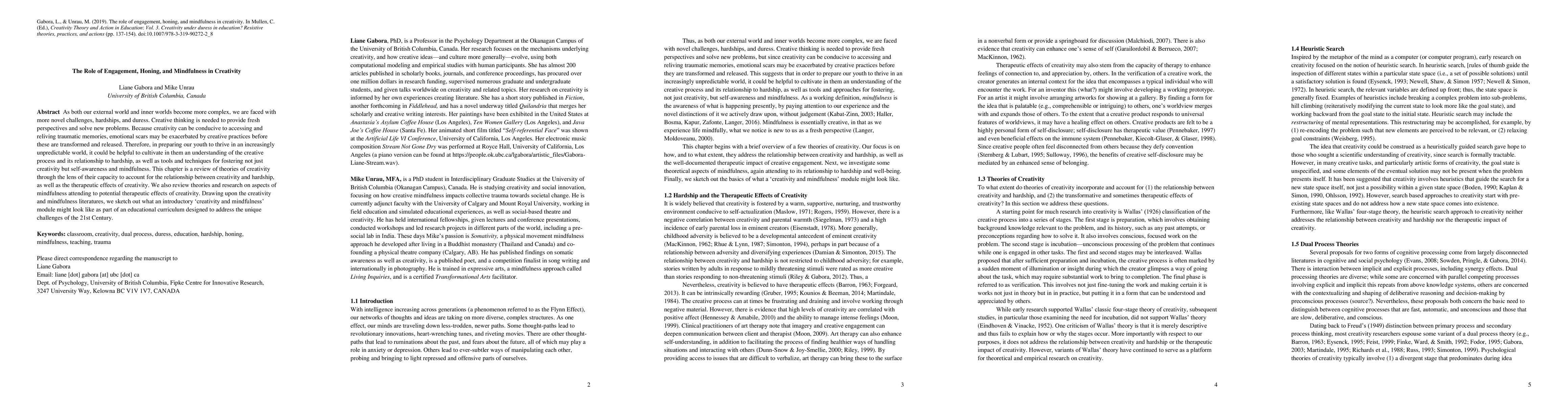 As both our external world and inner worlds become more complex, we are faced with more novel challenges, hardships, and duress. Creative thinking is needed to provide fresh perspectives and solve new problems.Because creativity can be conducive to accessing and reliving traumatic memories, emotional scars may be exacerbated by creative practices before these are transformed and released. Therefore, in preparing our youth to thrive in an increasingly unpredictable world, it could be helpful to cultivate in them an understanding of the creative process and its relationship to hardship, as well as tools and techniques for fostering not just creativity but self-awareness and mindfulness. This chapter is a review of theories of creativity through the lens of their capacity to account for the relationship between creativity and hardship, as well as the therapeutic effects of creativity. We also review theories and research on aspects of mindfulness attending to potential therapeutic effects of creativity. Drawing upon the creativity and mindfulness literatures, we sketch out what an introductory 'creativity and mindfulness' module might look like as part of an educational curriculum designed to address the unique challenges of the 21st Century.