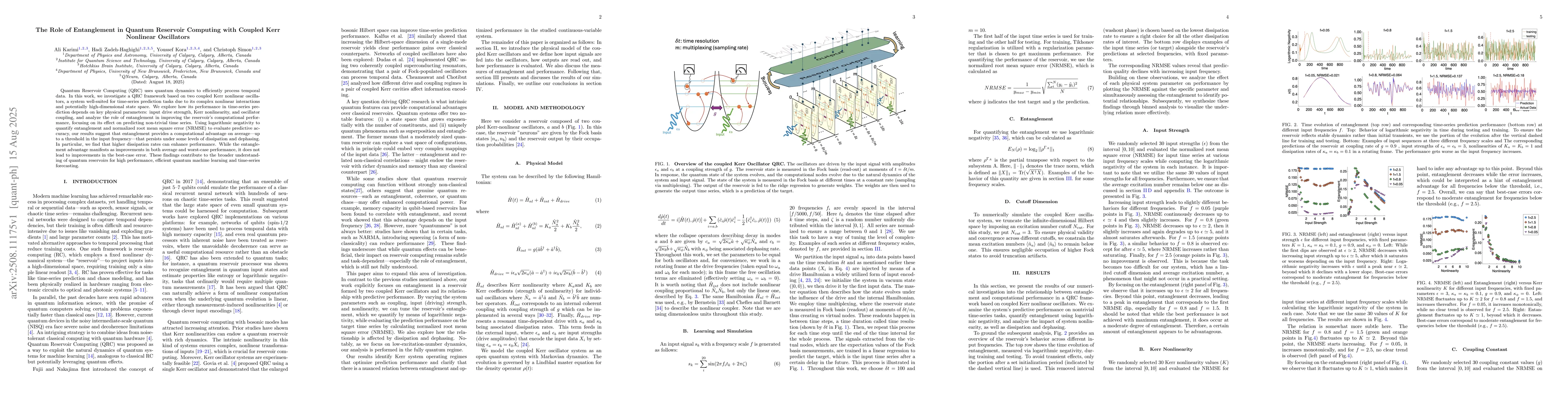 Quantum Reservoir Computing (QRC) uses quantum dynamics to efficiently process temporal data. In this work, we investigate a QRC framework based on two coupled Kerr nonlinear oscillators, a system well-suited for time-series prediction tasks due to its complex nonlinear interactions and potentially high-dimensional state space. We explore how its performance in time-series prediction depends on key physical parameters: input drive strength, Kerr nonlinearity, and oscillator coupling, and analyze the role of entanglement in improving the reservoir's computational performance, focusing on its effect on predicting non-trivial time series. Using logarithmic negativity to quantify entanglement and normalized root mean square error (NRMSE) to evaluate predictive accuracy, our results suggest that entanglement provides a computational advantage on average-up to a threshold in the input frequency-that persists under some levels of dissipation and dephasing. In particular, we find that higher dissipation rates can enhance performance. While the entanglement advantage manifests as improvements in both average and worst-case performance, it does not lead to improvements in the best-case error. These findings contribute to the broader understanding of quantum reservoirs for high performance, efficient quantum machine learning and time-series forecasting.